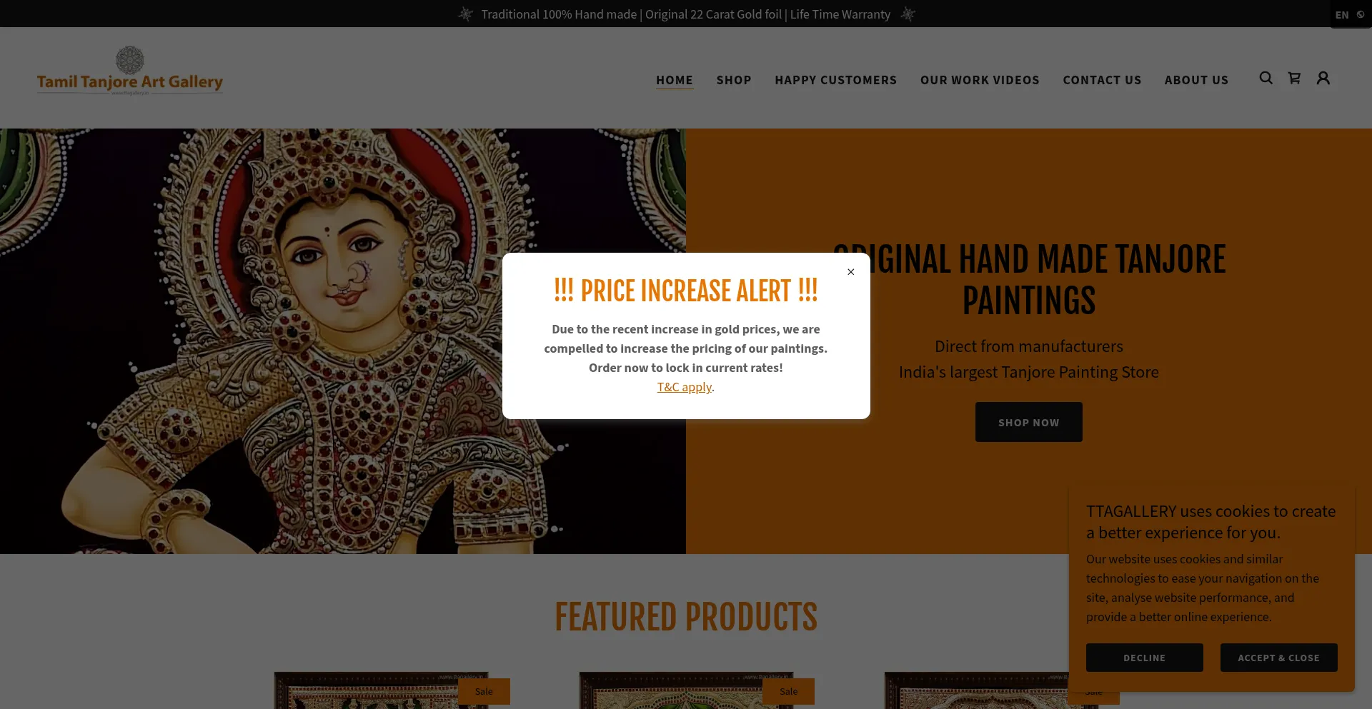 分析表明 ttagallery.in 作为电子商务平台运营,促进商品或服务的在线交易。该网站实现了购物车功能、支付处理系统和产品目录功能,这些是商业零售运营的典型特征。