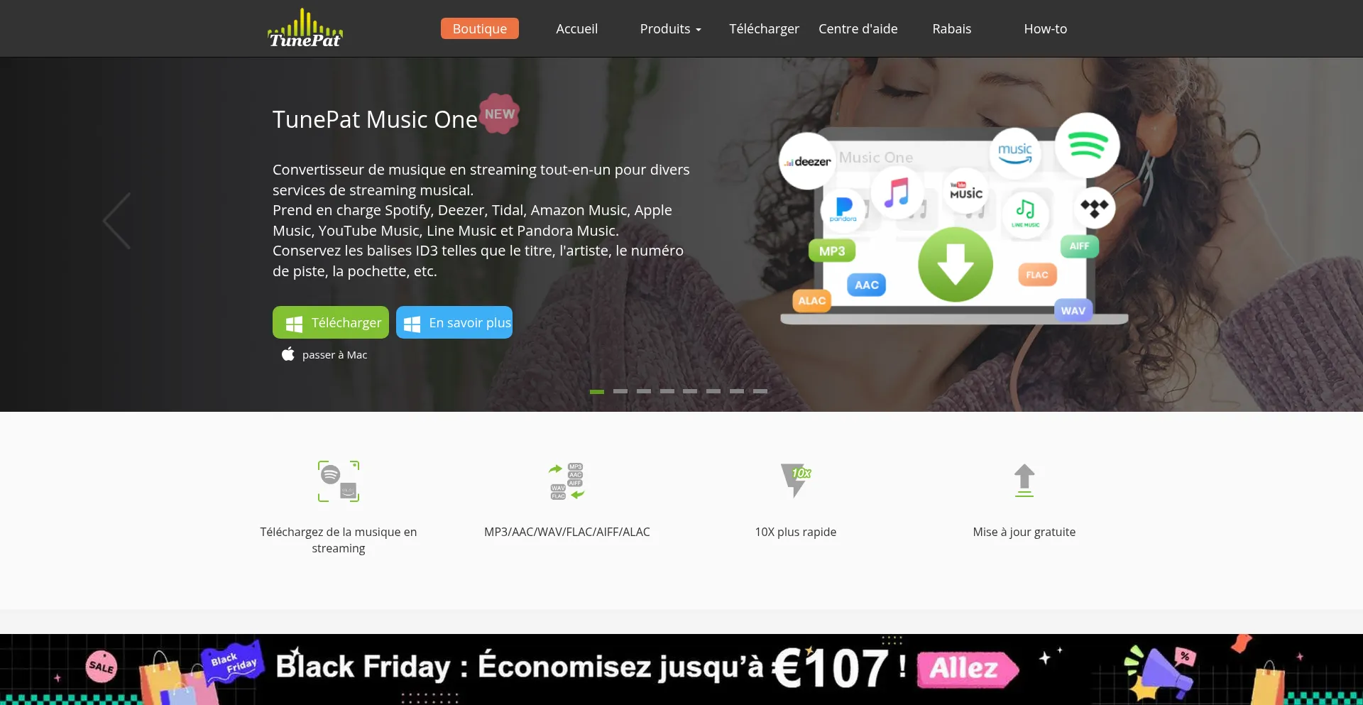 TunePat propose des logiciels de conversion comme Spotify Converter, Apple Music Converter, Tidal Meida Downloader, Amazon Music Converteret, YouTube Music Converter et Any Audi...