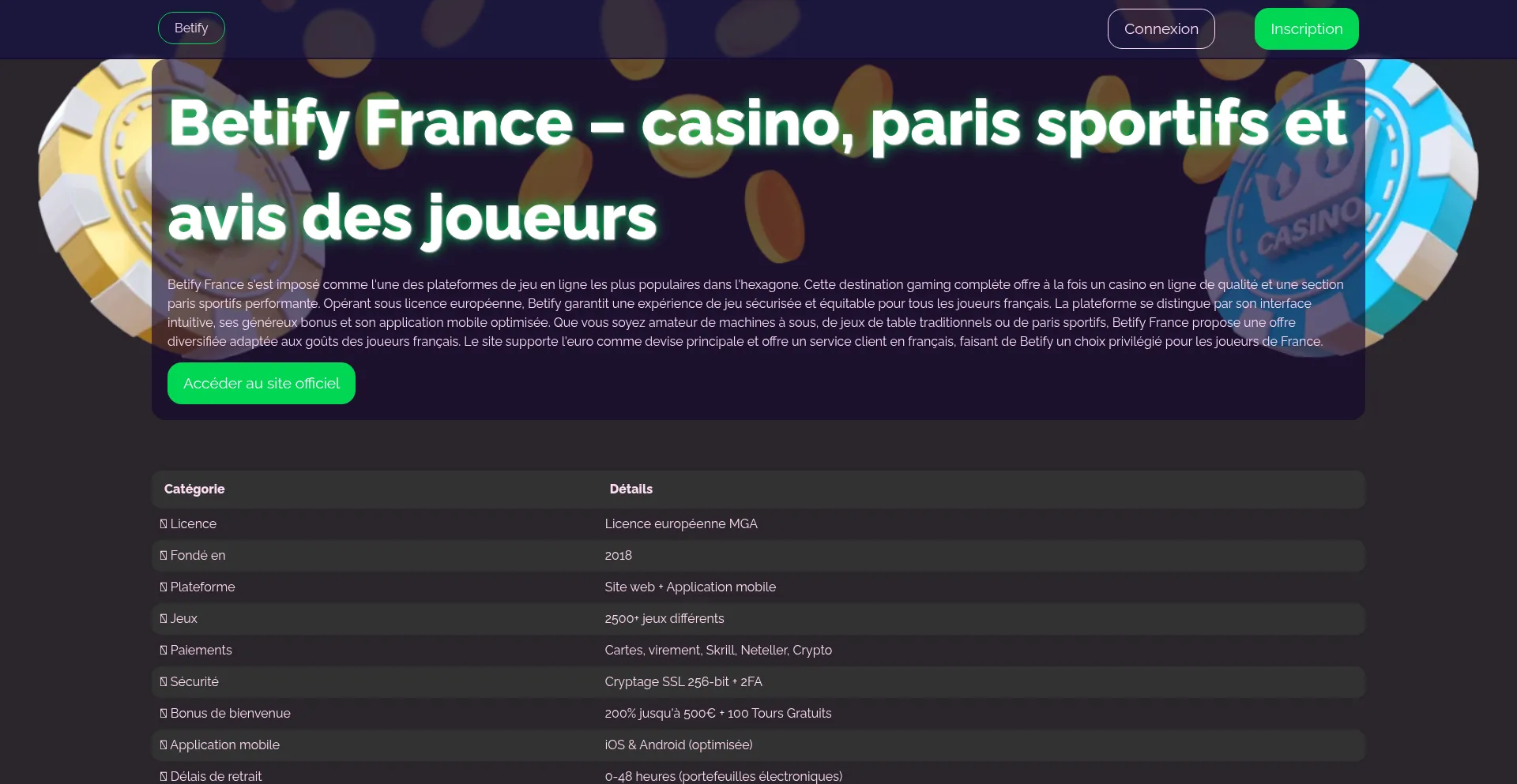 Découvrez Betify France 🇫🇷 : casino en ligne, paris sportifs, bonus exclusifs et application mobile. Inscrivez-vous, utilisez un code promo Betify et profitez de retraits...