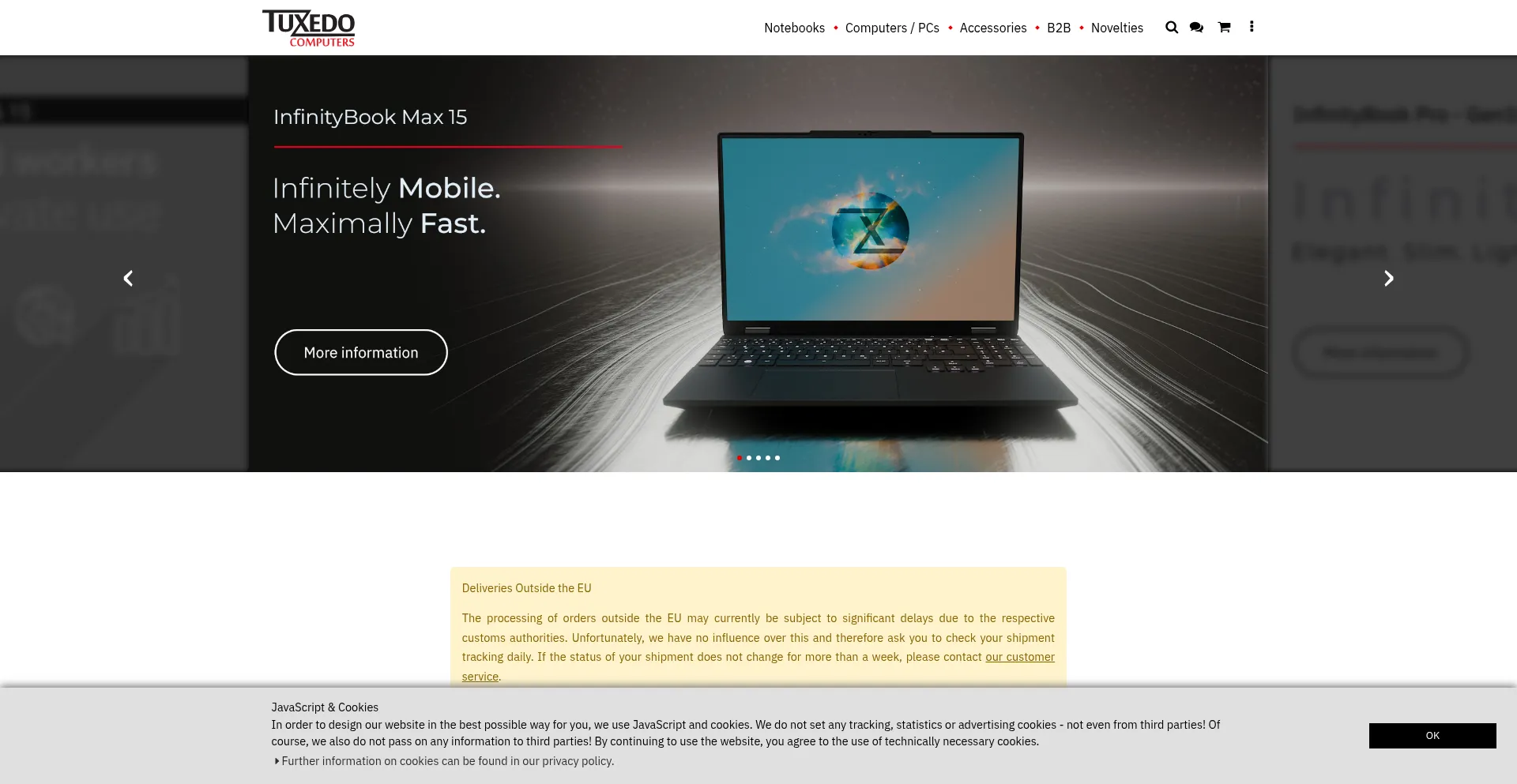 分析表明 tuxedocomputers.com 作为电子商务平台运营,促进商品或服务的在线交易。该网站实现了购物车功能、支付处理系统和产品目录功能,这些是商业零售运营的典型特征。