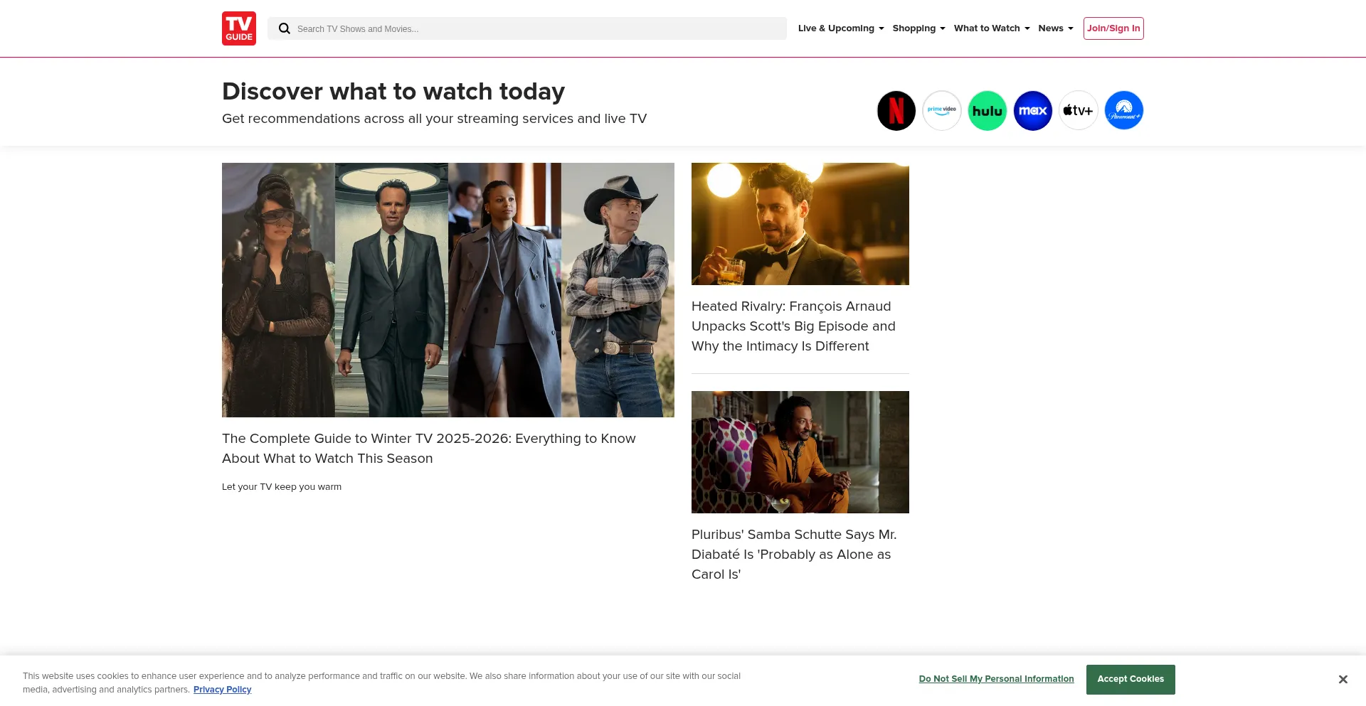 该网站实现符合GDPR或CCPA等隐私法规的cookie同意机制。这表明 tvguide.com 遵守数据保护标准并为用户提供对个人数据收集实践的控制。