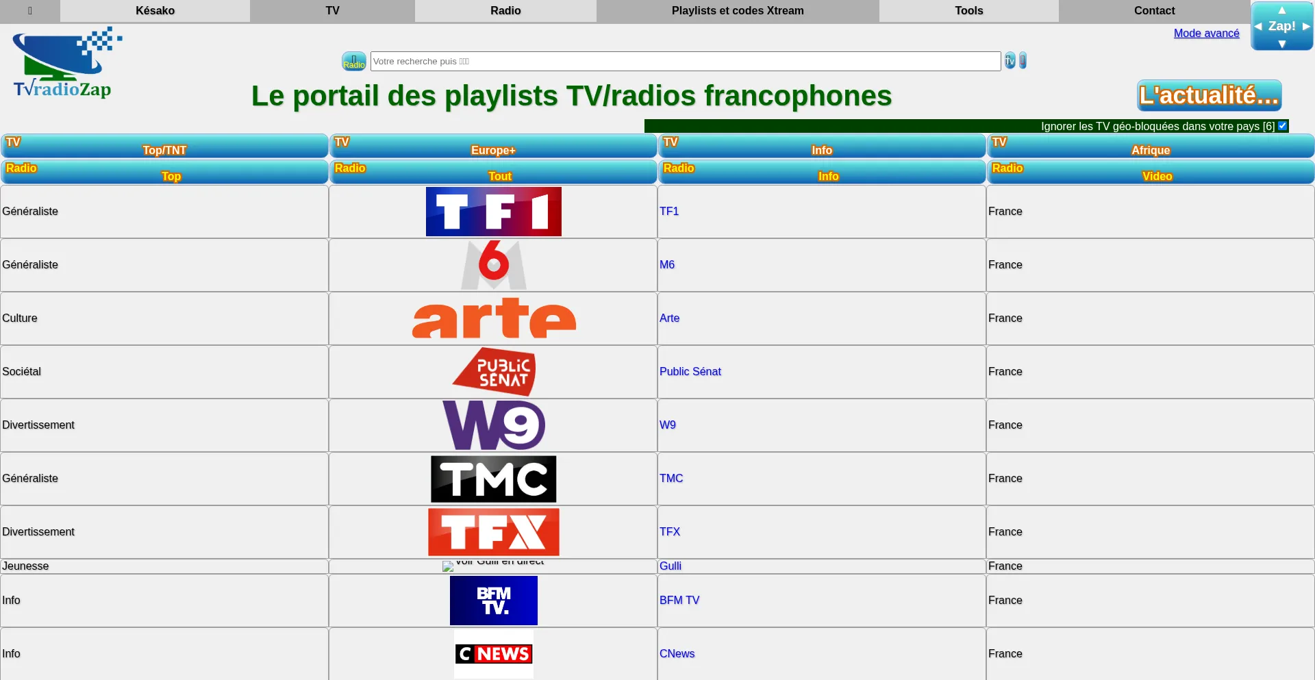 TVradioZap, portail de liens http vers les flux radios/TV francophones et générateur de playlists radio/TV télé pour lecteurs audio/video tel VLC, TV connectées, box TV Android, enigma2…