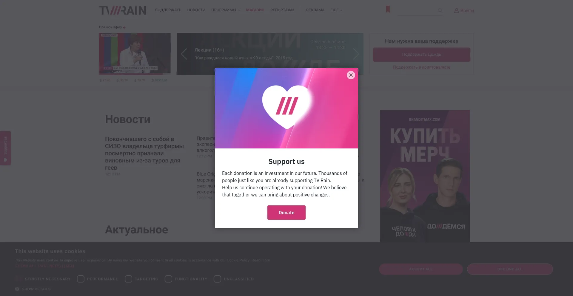 该网站实现符合GDPR或CCPA等隐私法规的cookie同意机制。这表明 tvrain.tv 遵守数据保护标准并为用户提供对个人数据收集实践的控制。