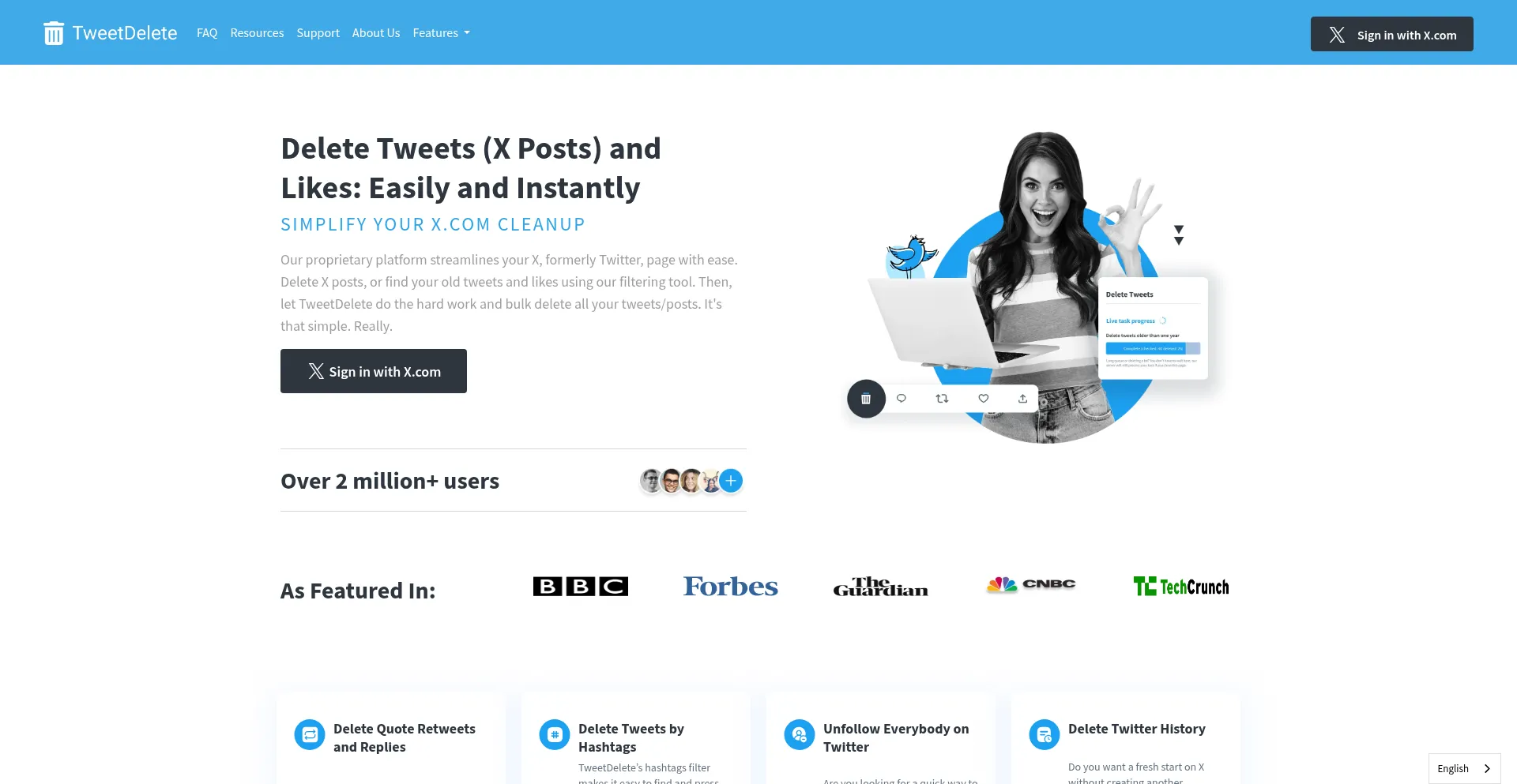 Delete tweets (X posts) fast with TweetDelete. Effortlessly mass delete tweets based on age or keywords. Run it once or use auto-delete to keep your X profile fresh!