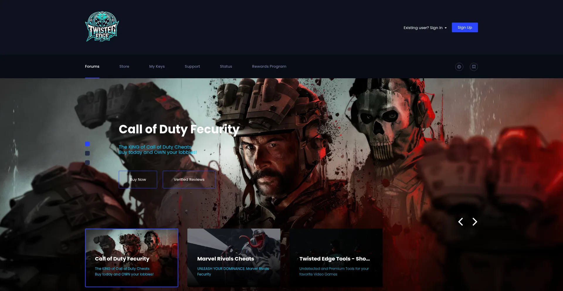 Twisted Edge presents you Undetected & Premium Cheats for your favorite video games! We have dozens of cheats from EFT to COD, Apex, Fortnite, GTA5, The Finals, BF2042, Dayz, Ru...