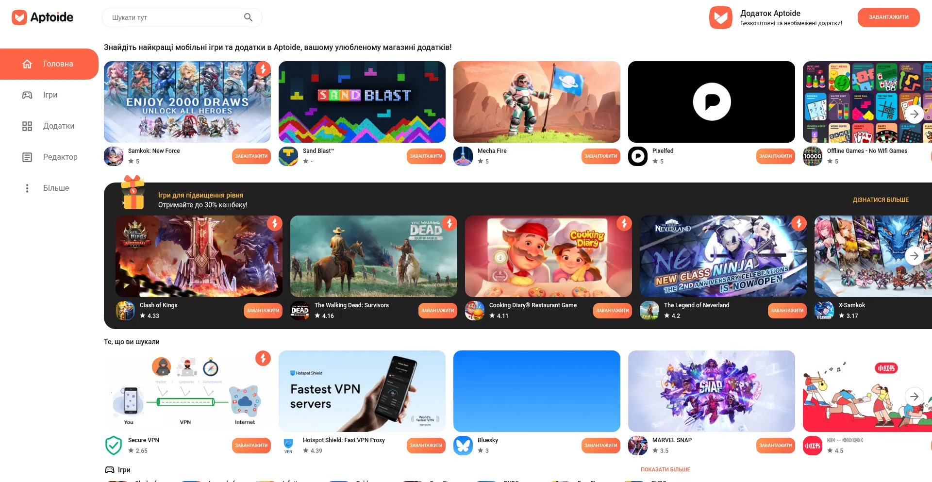 网站上存在社交媒体链接表明 ua.aptoide.com 在社交媒体上维护官方账户,这是可信度和参与度的积极信号。