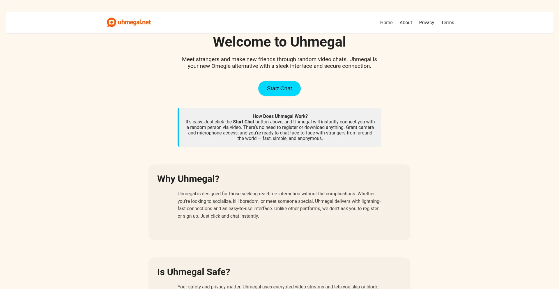 Uhmegal is your modern Omegle alternative. Click Start Chat and meet new people instantly via video chat.