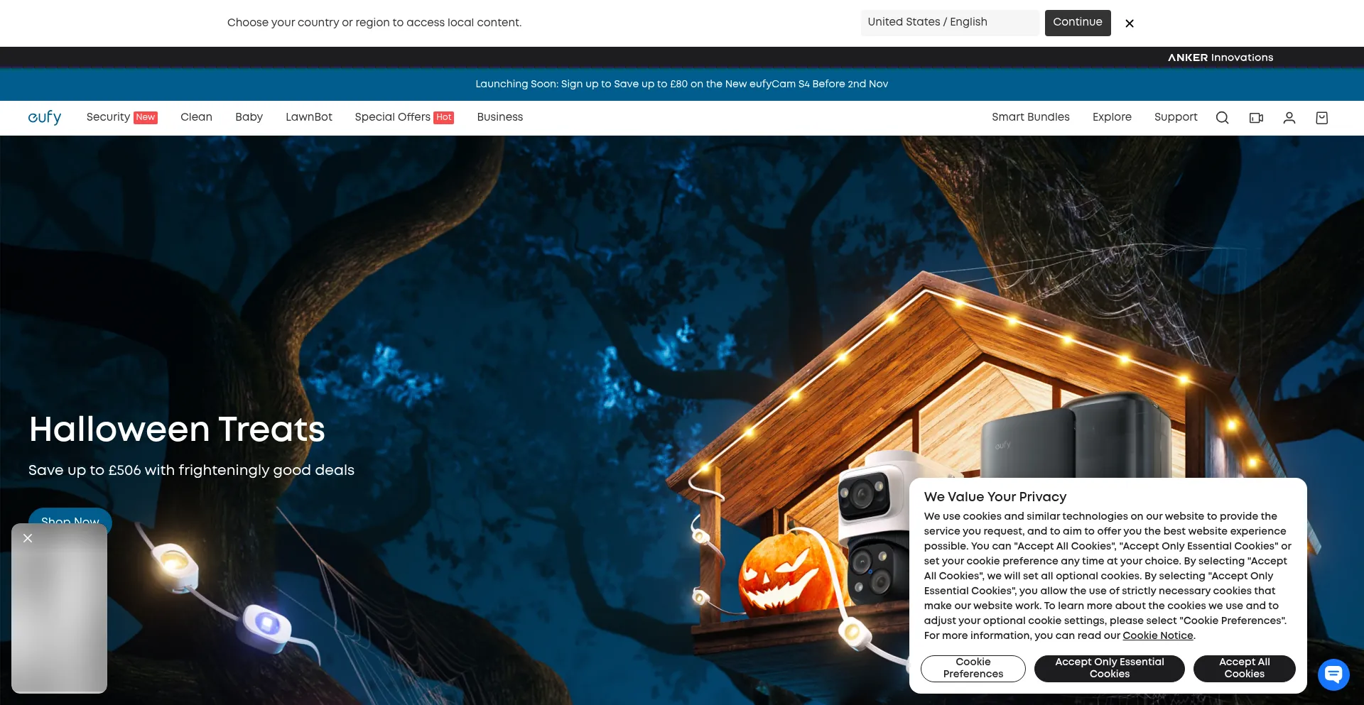 分析表明 uk.eufy.com 作为电子商务平台运营,促进商品或服务的在线交易。该网站实现了购物车功能、支付处理系统和产品目录功能,这些是商业零售运营的典型特征。