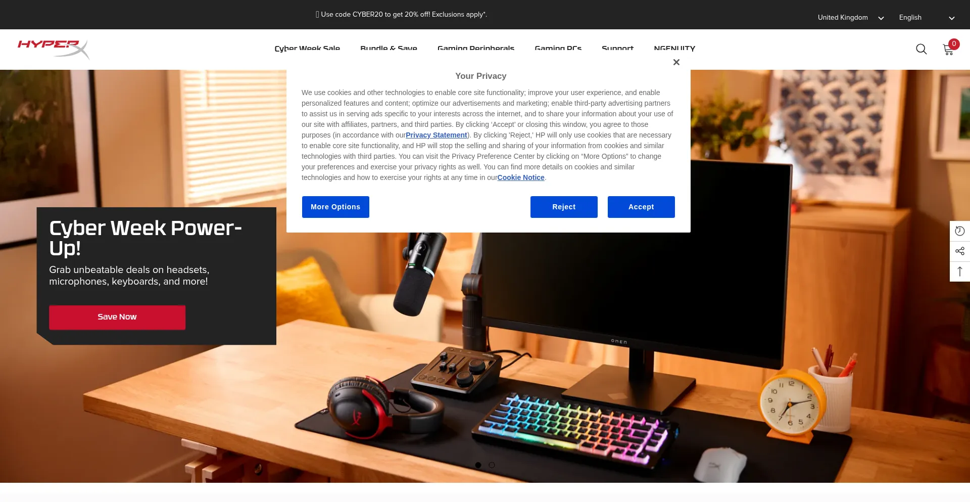 该网站实现符合GDPR或CCPA等隐私法规的cookie同意机制。这表明 uk.hyperx.com 遵守数据保护标准并为用户提供对个人数据收集实践的控制。