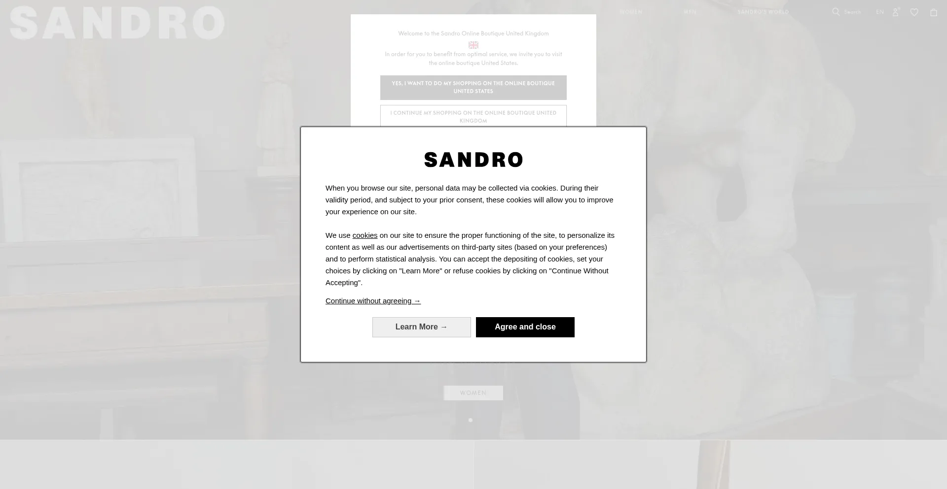 该网站实现符合GDPR或CCPA等隐私法规的cookie同意机制。这表明 uk.sandro-paris.com 遵守数据保护标准并为用户提供对个人数据收集实践的控制。