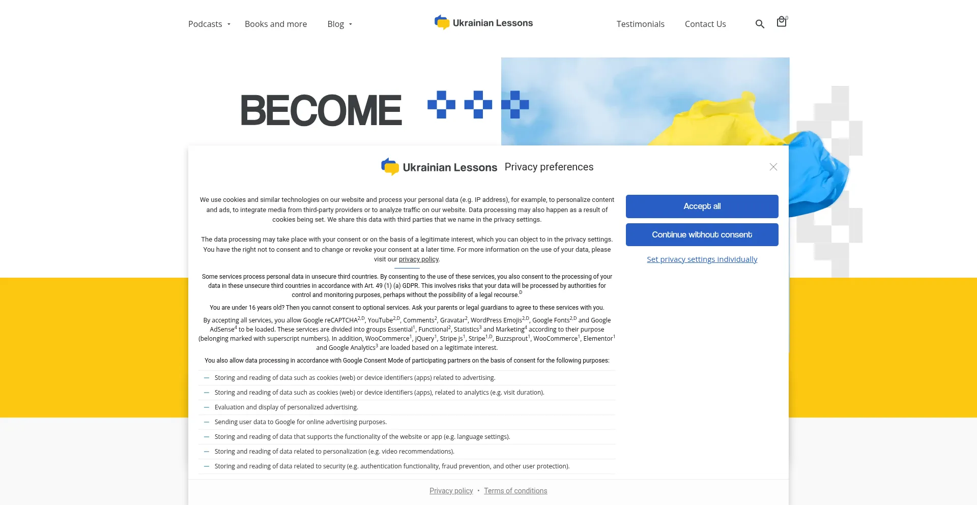 该网站实现符合GDPR或CCPA等隐私法规的cookie同意机制。这表明 ukrainianlessons.com 遵守数据保护标准并为用户提供对个人数据收集实践的控制。