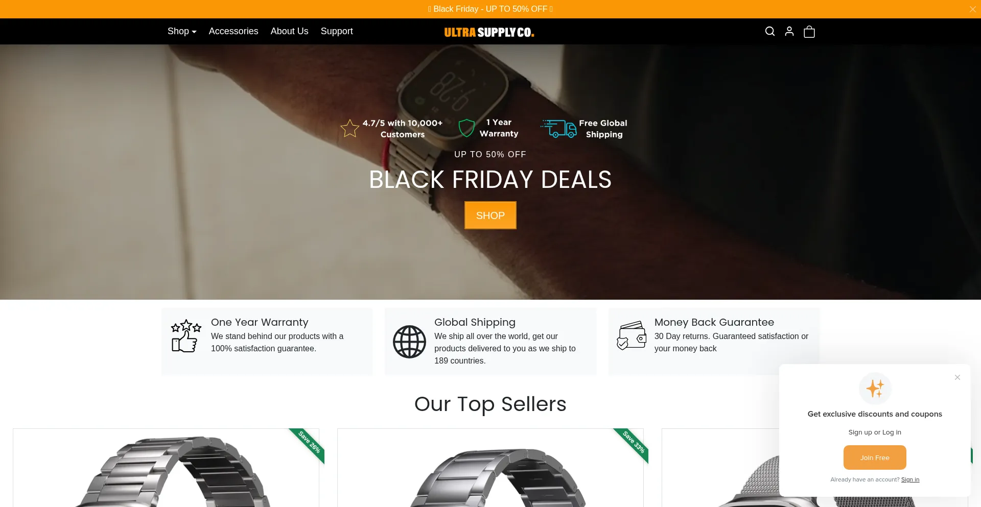 该网站利用流行产品名称和品牌来吸引流量并产生用户兴趣。这些产品可能通过促销活动或折扣策略提供,旨在增加 ultrasupplyco.com 的访客参与度和转化率。