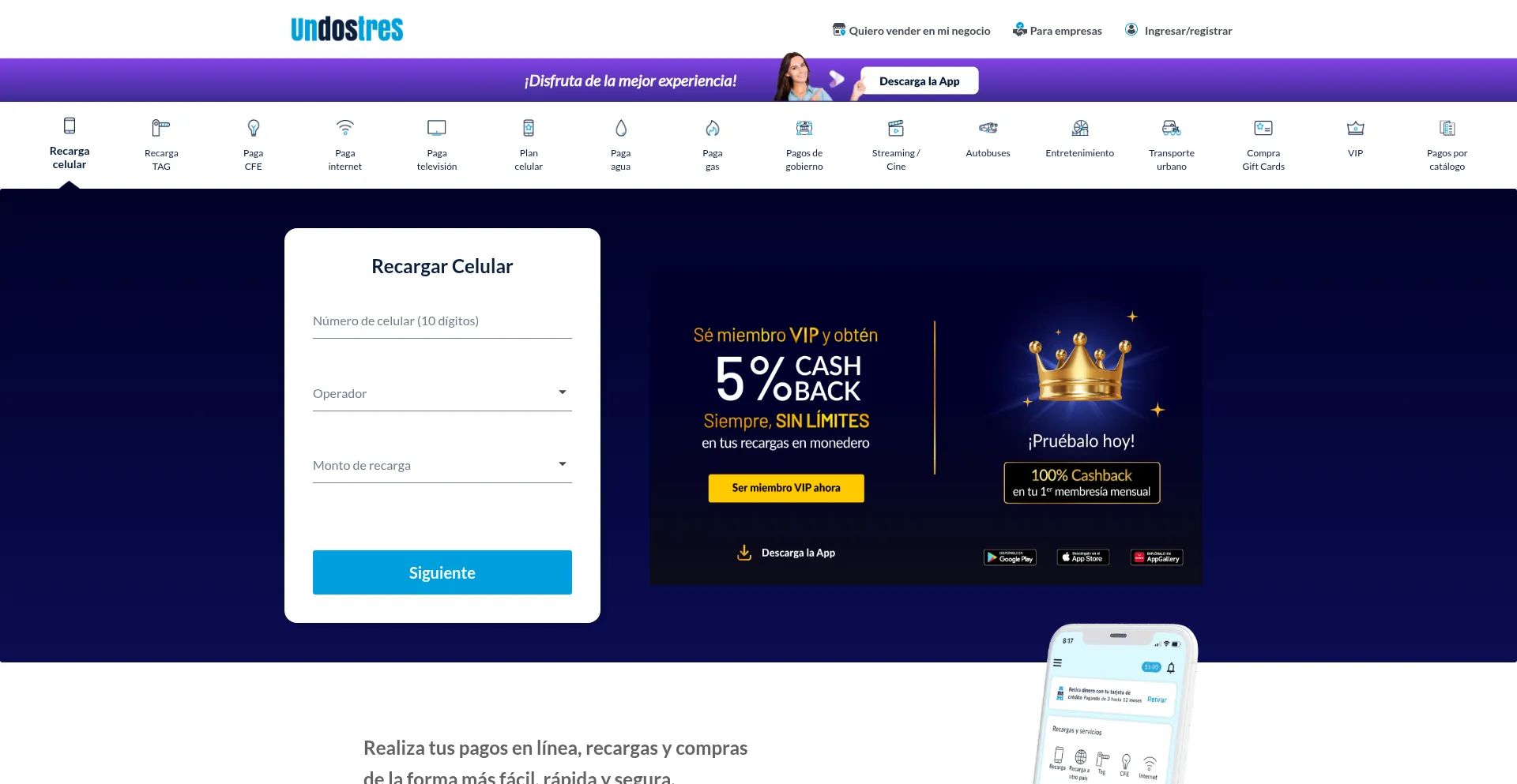 UnDosTres - Recargas en línea Telcel, Movistar, AT&T, Unefon, Virgin, Bait, TeleVía, PASE, Boletos de Cine, Pagos CFE