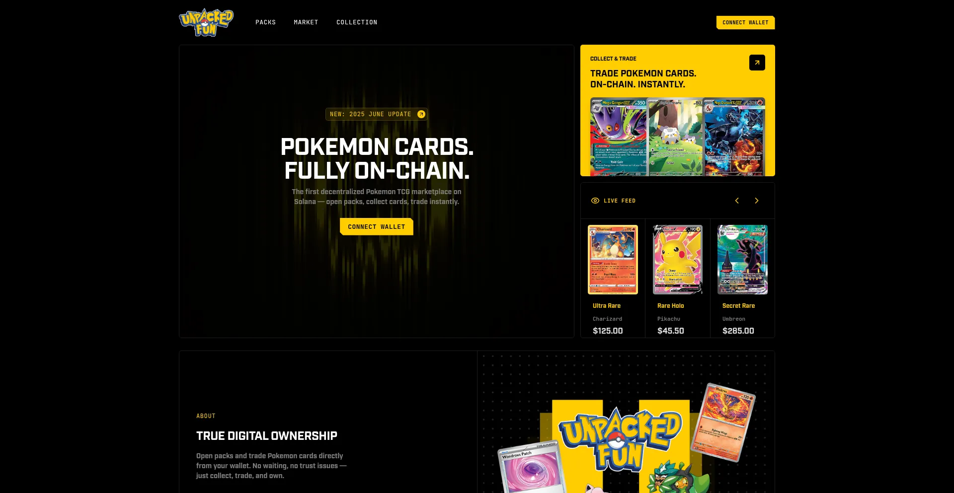 The first decentralized Pokemon TCG marketplace on Solana — open packs, collect cards, trade instantly.