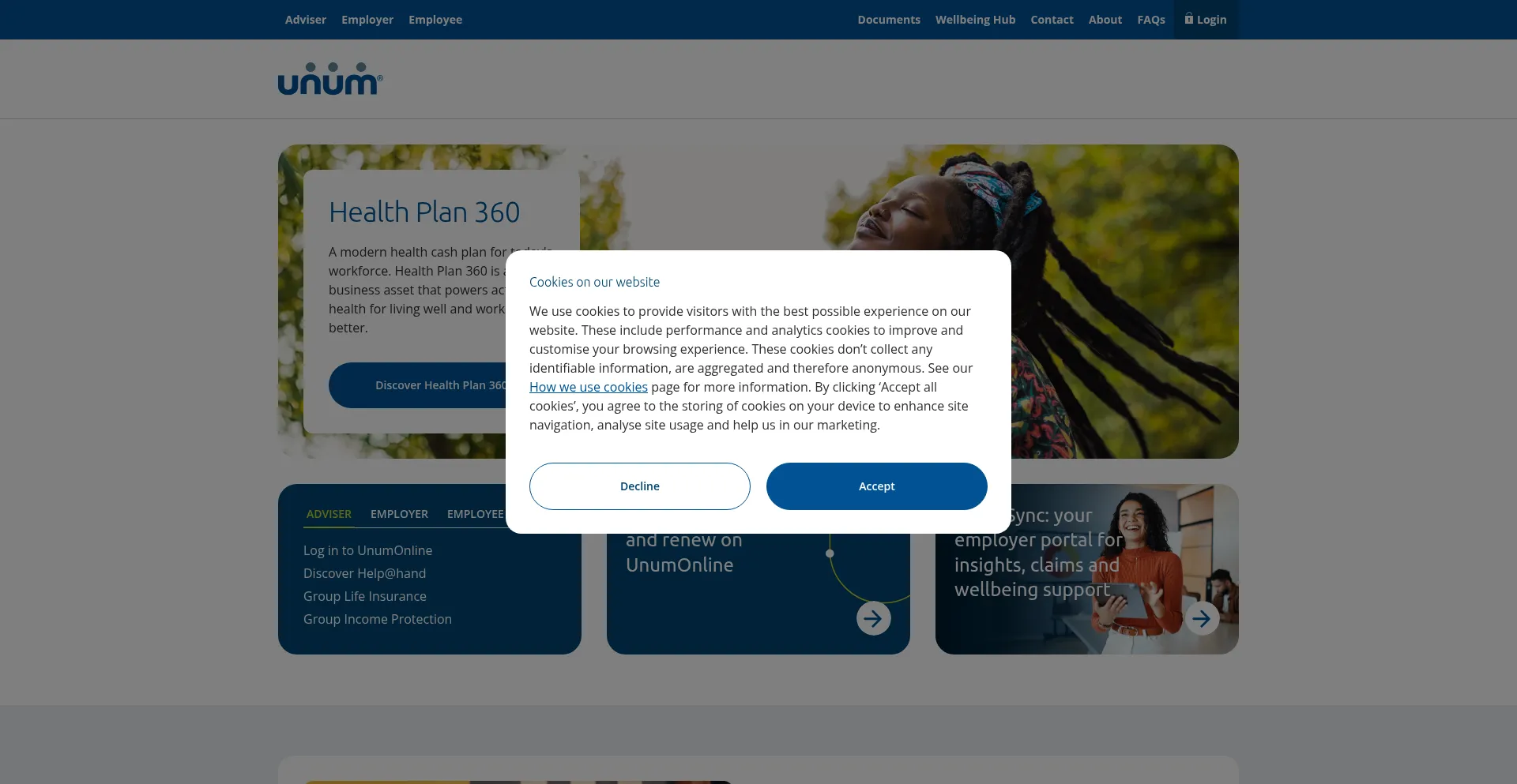 该网站实现符合GDPR或CCPA等隐私法规的cookie同意机制。这表明 unum.co.uk 遵守数据保护标准并为用户提供对个人数据收集实践的控制。