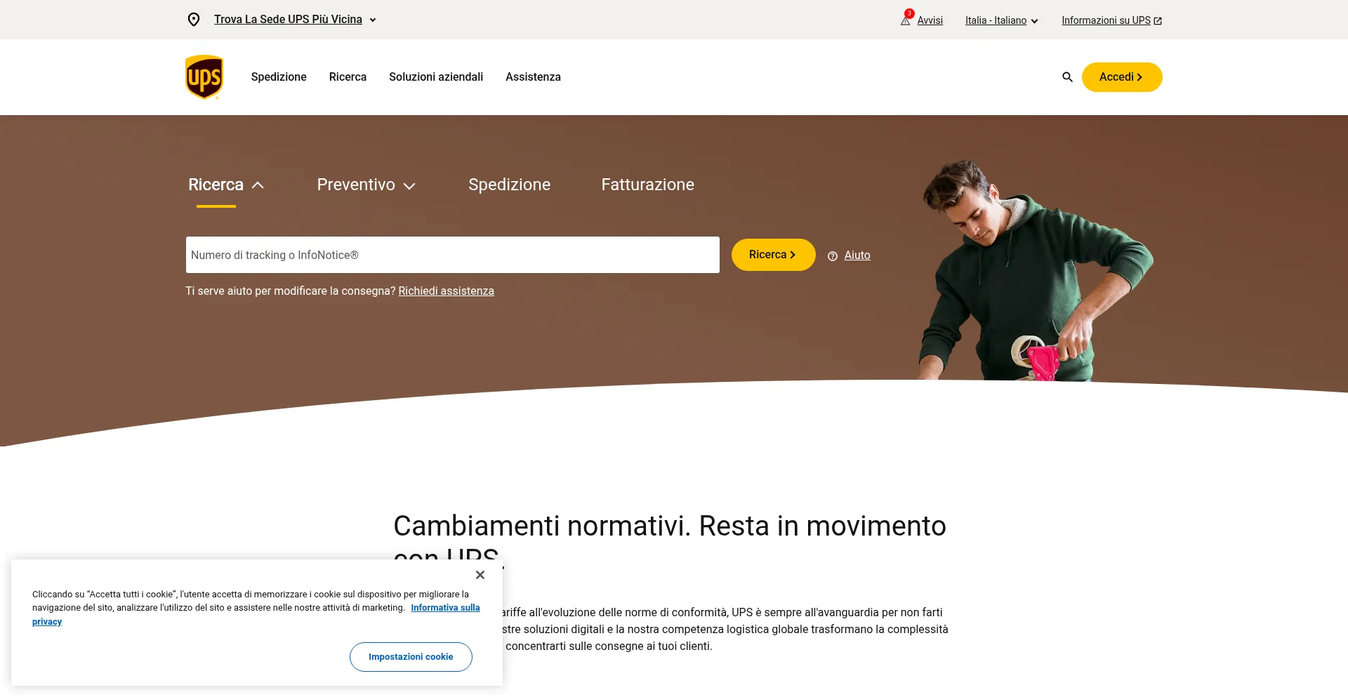 该网站实现符合GDPR或CCPA等隐私法规的cookie同意机制。这表明 ups.it 遵守数据保护标准并为用户提供对个人数据收集实践的控制。