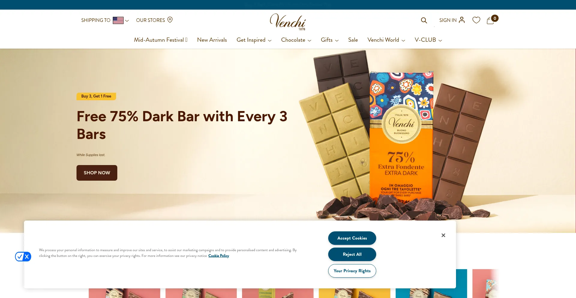 该网站实现符合GDPR或CCPA等隐私法规的cookie同意机制。这表明 us.venchi.com 遵守数据保护标准并为用户提供对个人数据收集实践的控制。