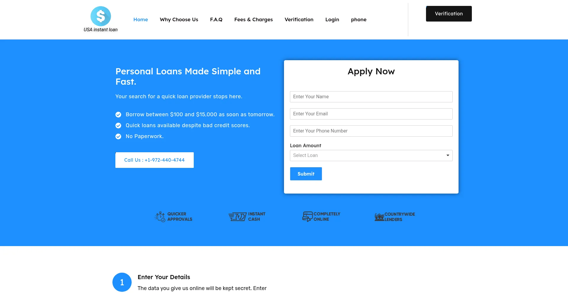 该网站实现数据收集表单,请求个人信息,包括姓名、电子邮件地址、电话号码或其他敏感详细信息。用户应验证 usainstantloan.com 的合法性并在提交个人数据前查看隐私政策。