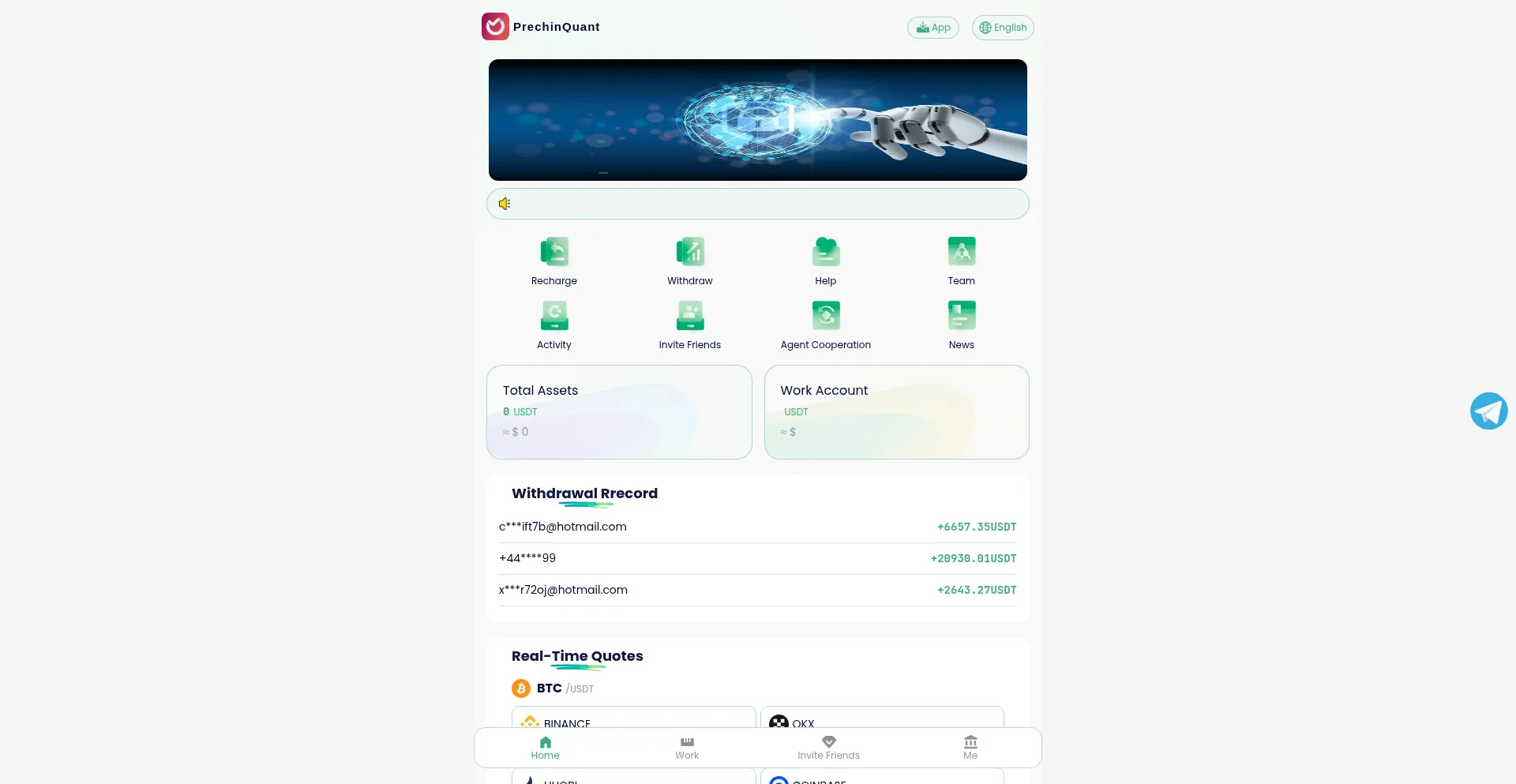 Usdtquant.com 运营欺诈性金融平台,推广具有不现实回报承诺的欺骗性投资机会。安全分析表明该平台采用与 庞氏骗局 和预付费欺诈一致的策略,旨在提取用户资金和个人信息。