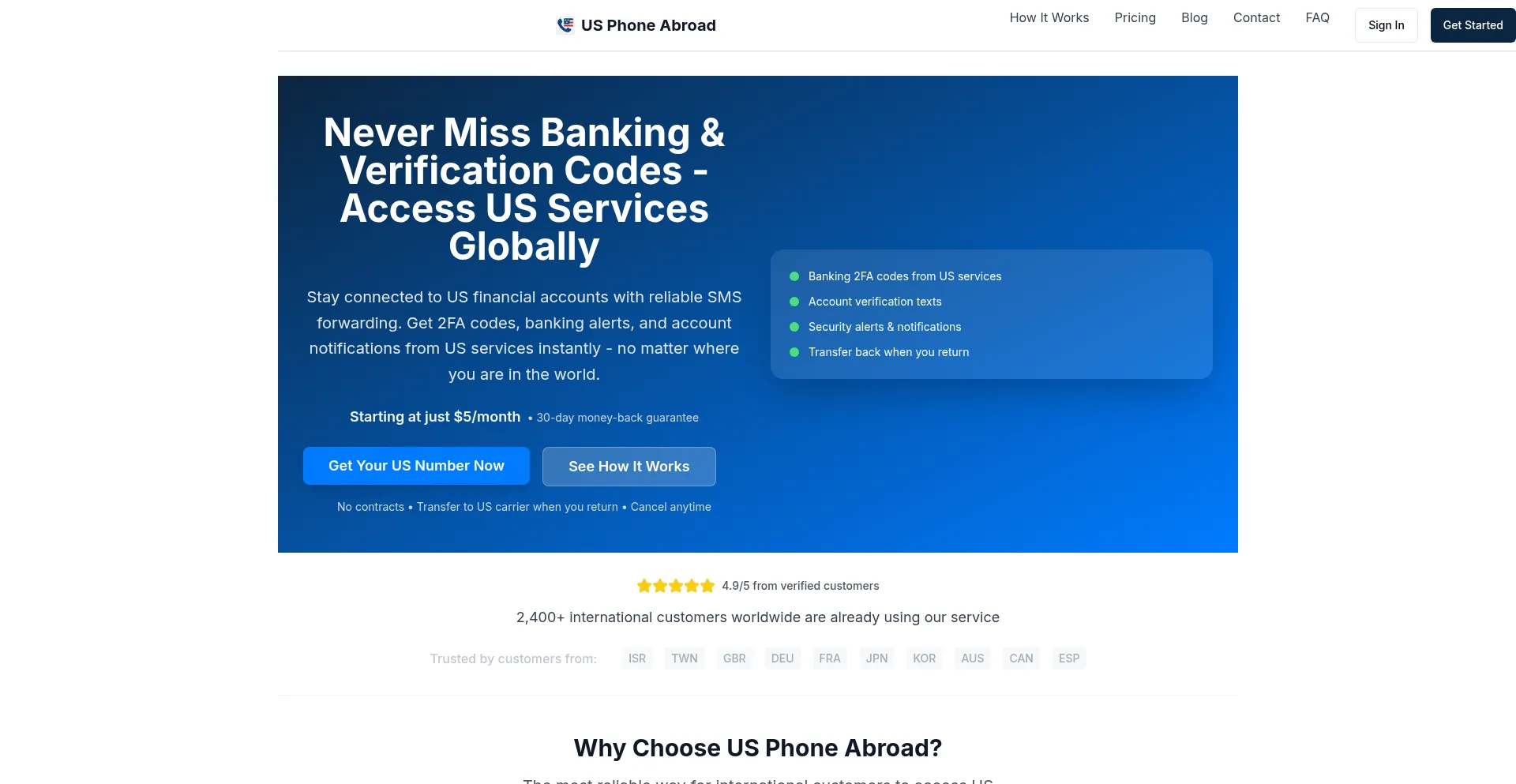 Never miss a verification code again. Get a reliable US virtual phone number for 2FA, banking, and calls while living abroad. Trusted by American expats worldwide.
