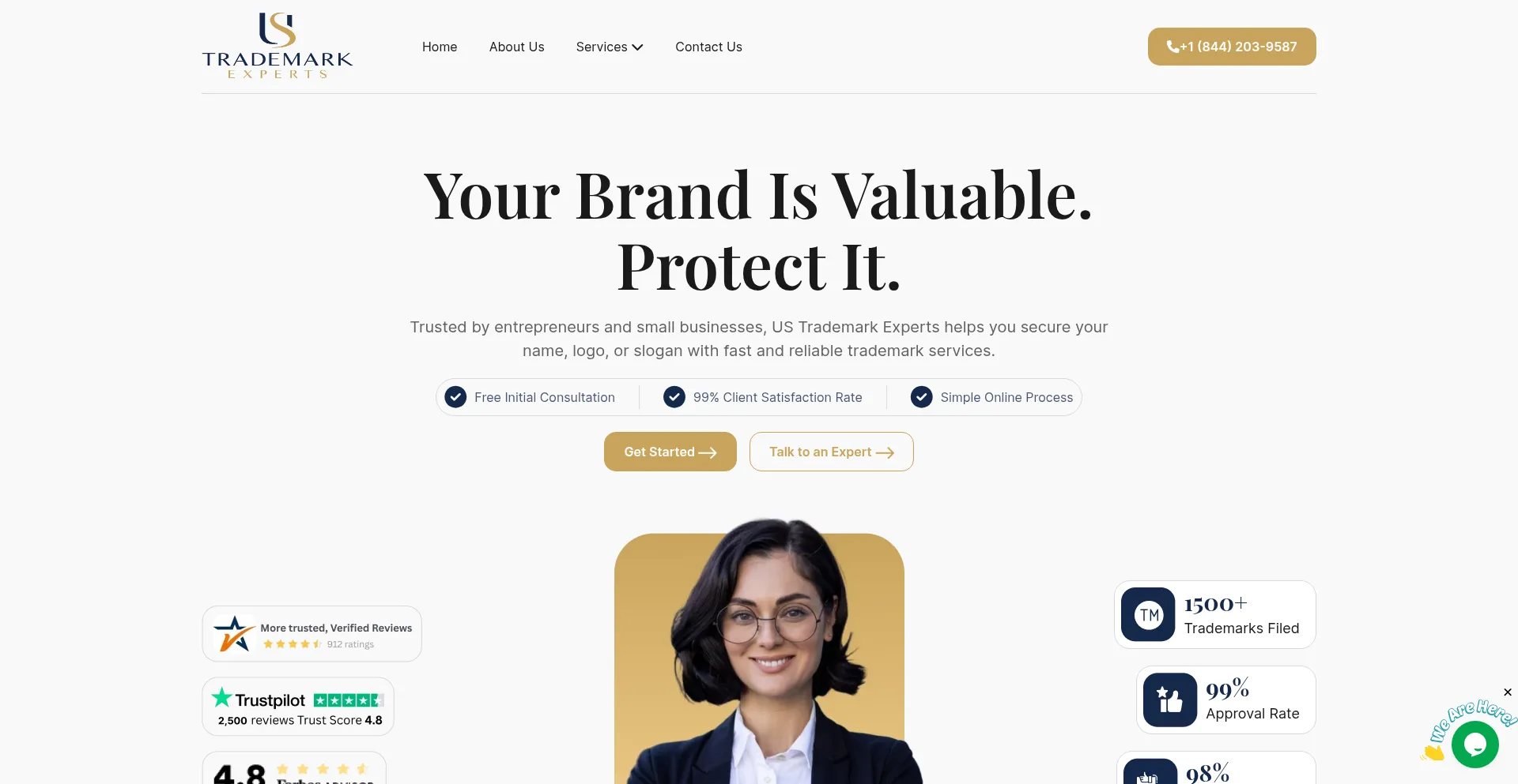 该网站实现数据收集表单,请求个人信息,包括姓名、电子邮件地址、电话号码或其他敏感详细信息。用户应验证 ustrademarkexperts.com 的合法性并在提交个人数据前查看隐私政策。