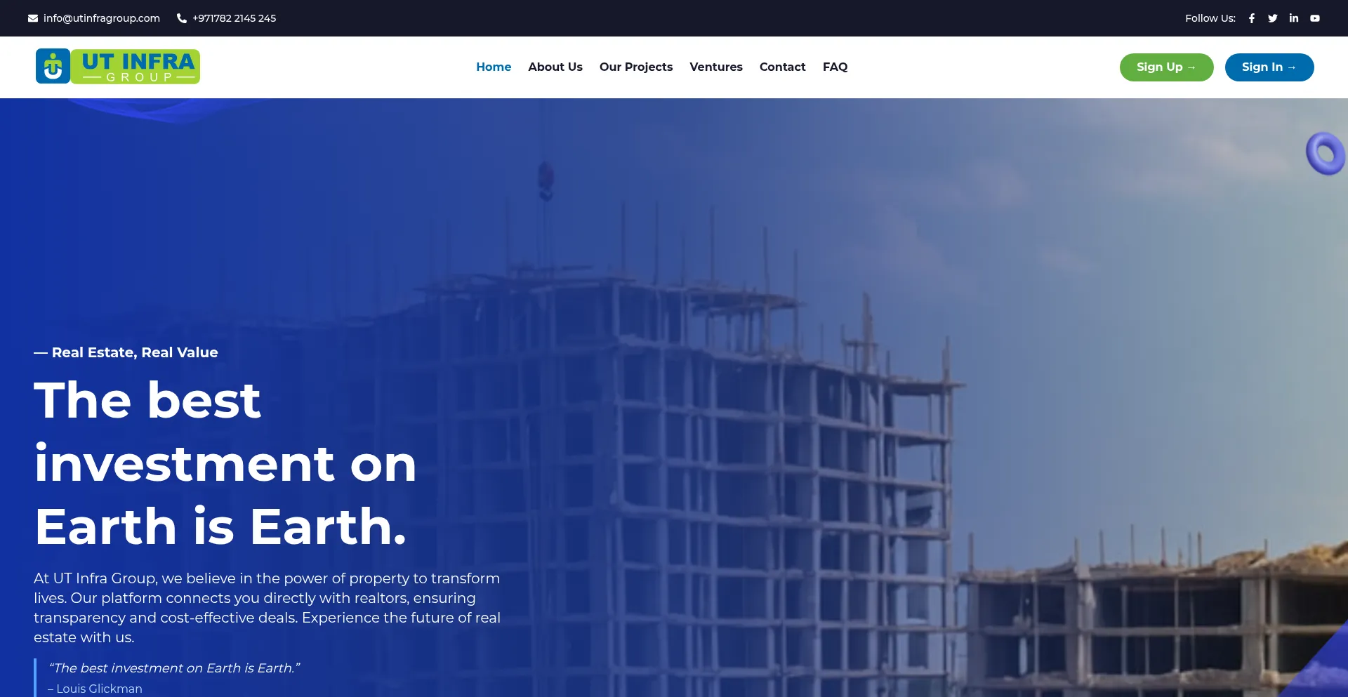 该网站实现数据收集表单,请求个人信息,包括姓名、电子邮件地址、电话号码或其他敏感详细信息。用户应验证 utinfragroup.com 的合法性并在提交个人数据前查看隐私政策。