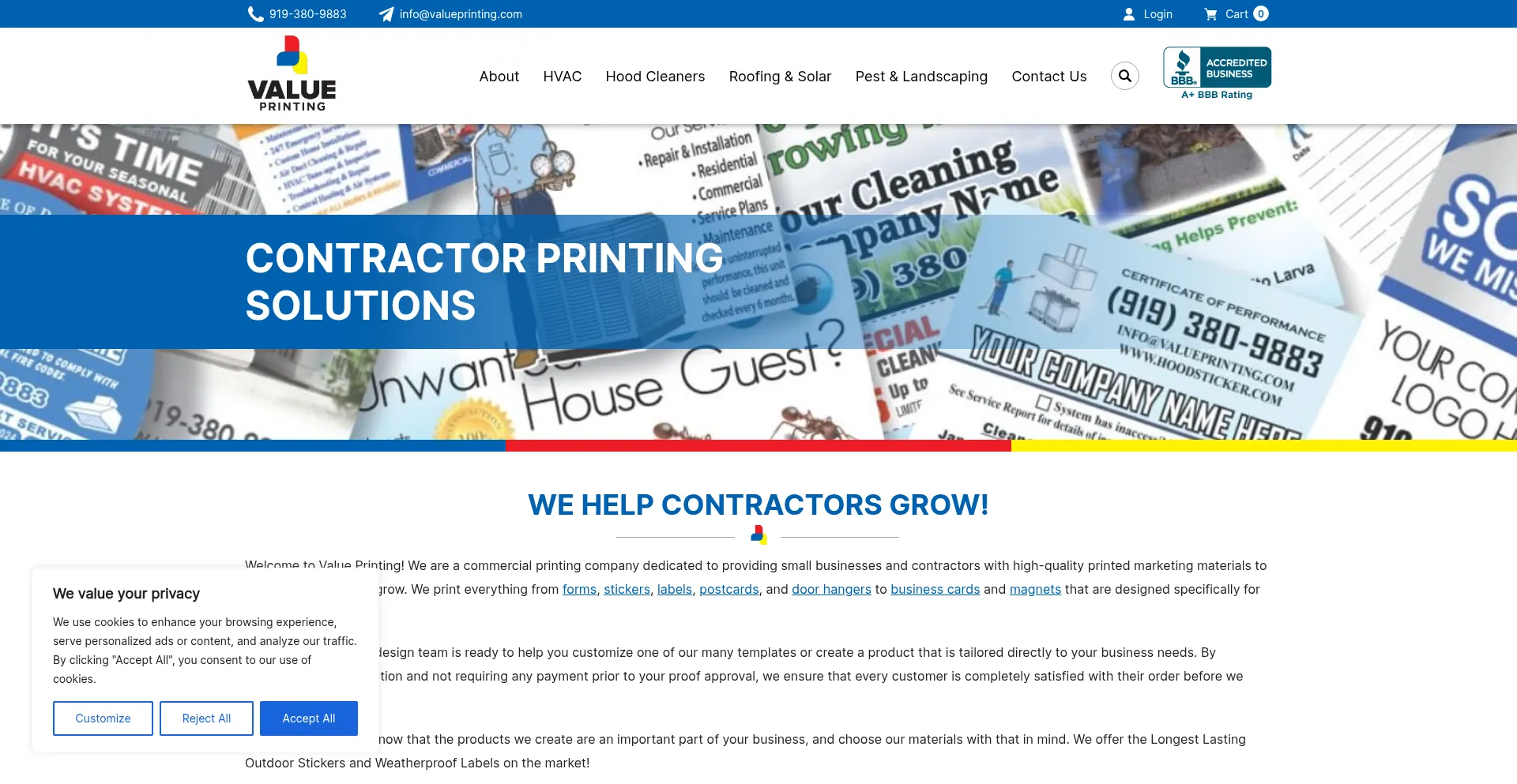 分析表明 valueprinting.com 作为电子商务平台运营,促进商品或服务的在线交易。该网站实现了购物车功能、支付处理系统和产品目录功能,这些是商业零售运营的典型特征。