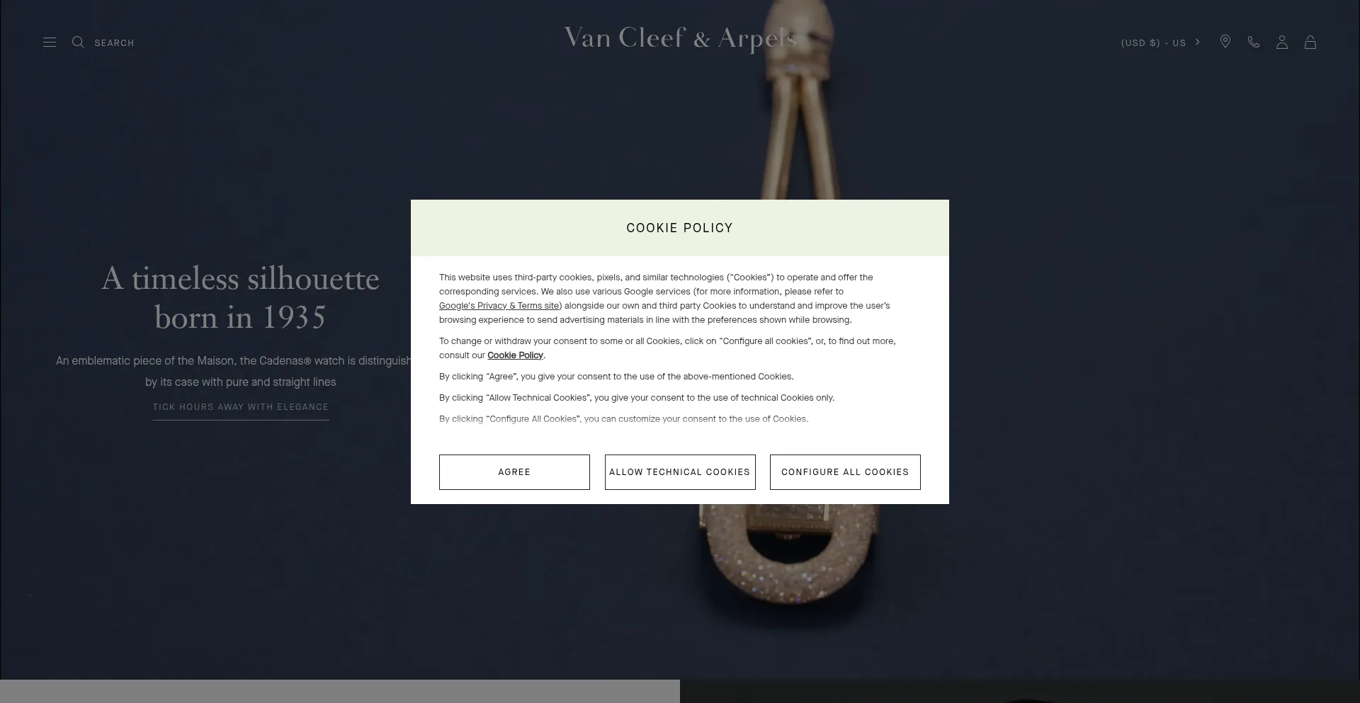 该网站实现符合GDPR或CCPA等隐私法规的cookie同意机制。这表明 vancleefarpels.com 遵守数据保护标准并为用户提供对个人数据收集实践的控制。