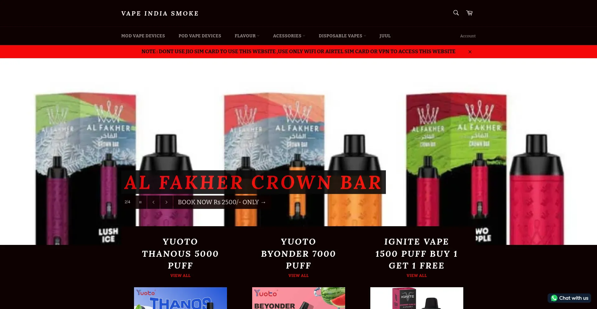 分析表明 vapeindiasmokes.in 作为电子商务平台运营,促进商品或服务的在线交易。该网站实现了购物车功能、支付处理系统和产品目录功能,这些是商业零售运营的典型特征。