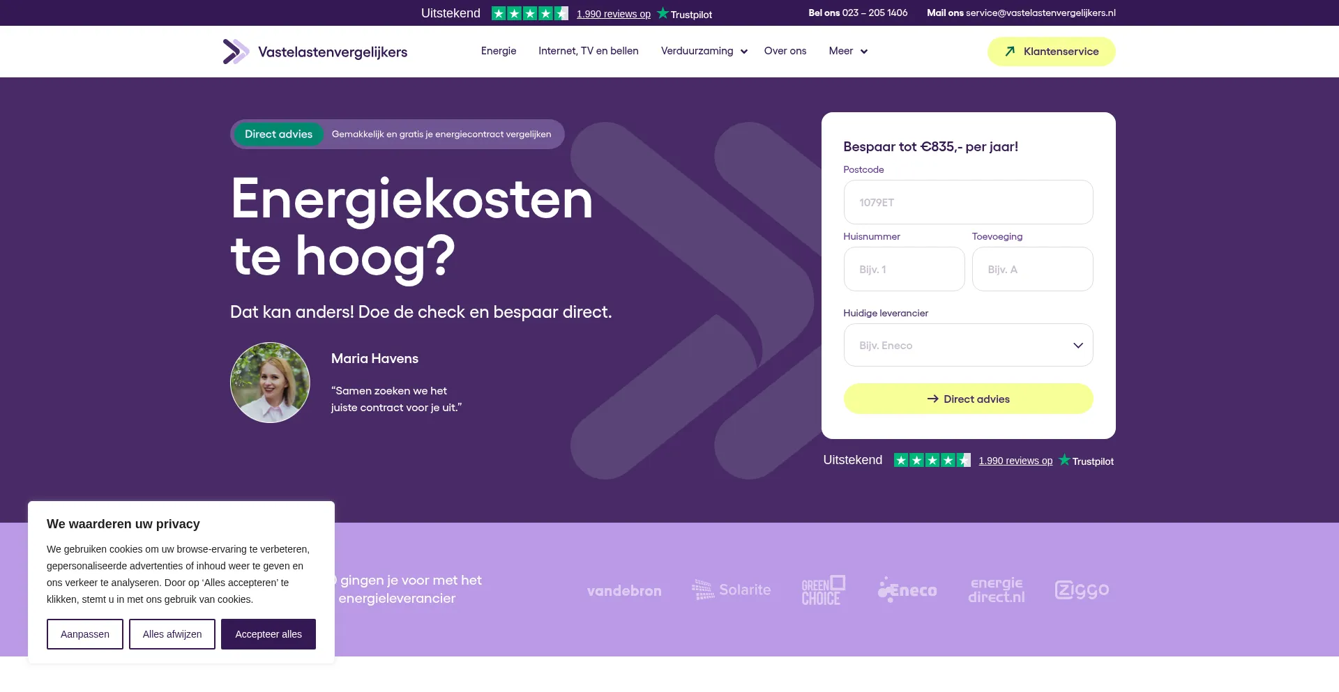 该网站实现符合GDPR或CCPA等隐私法规的cookie同意机制。这表明 vastelastenvergelijkers.nl 遵守数据保护标准并为用户提供对个人数据收集实践的控制。