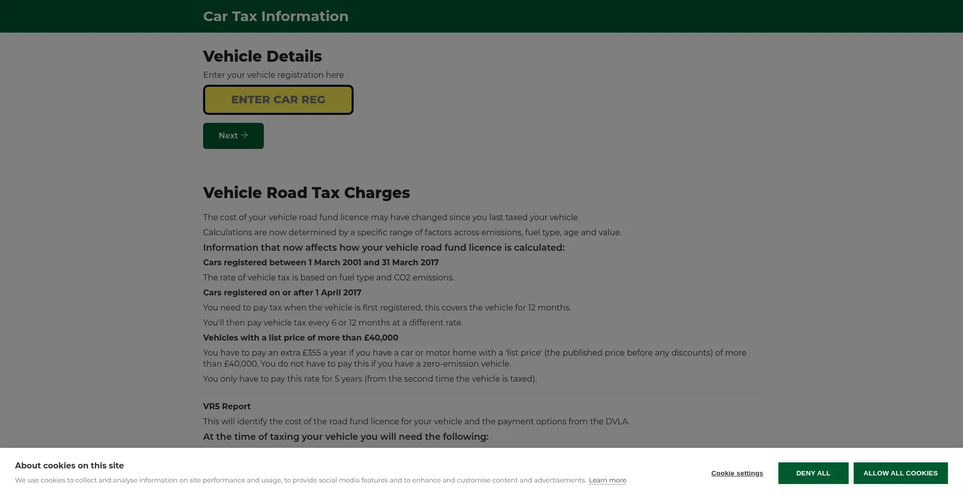 该网站实现数据收集表单,请求个人信息,包括姓名、电子邮件地址、电话号码或其他敏感详细信息。用户应验证 vehicleroadtax.co.uk 的合法性并在提交个人数据前查看隐私政策。