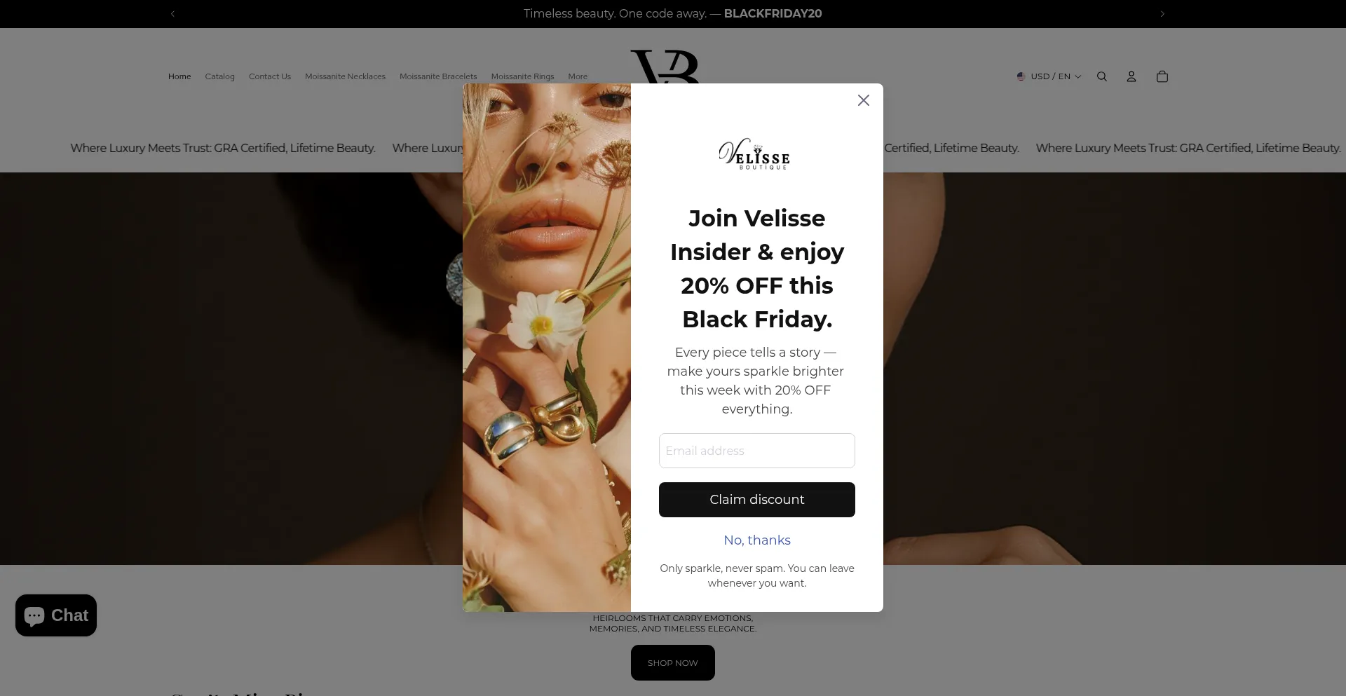 Explore Velisse Boutique’s certified Moissanite jewelry collection – rings, bracelets, necklaces & earrings. GRA certificate, 2-year warranty, luxury gift packaging & fast w...