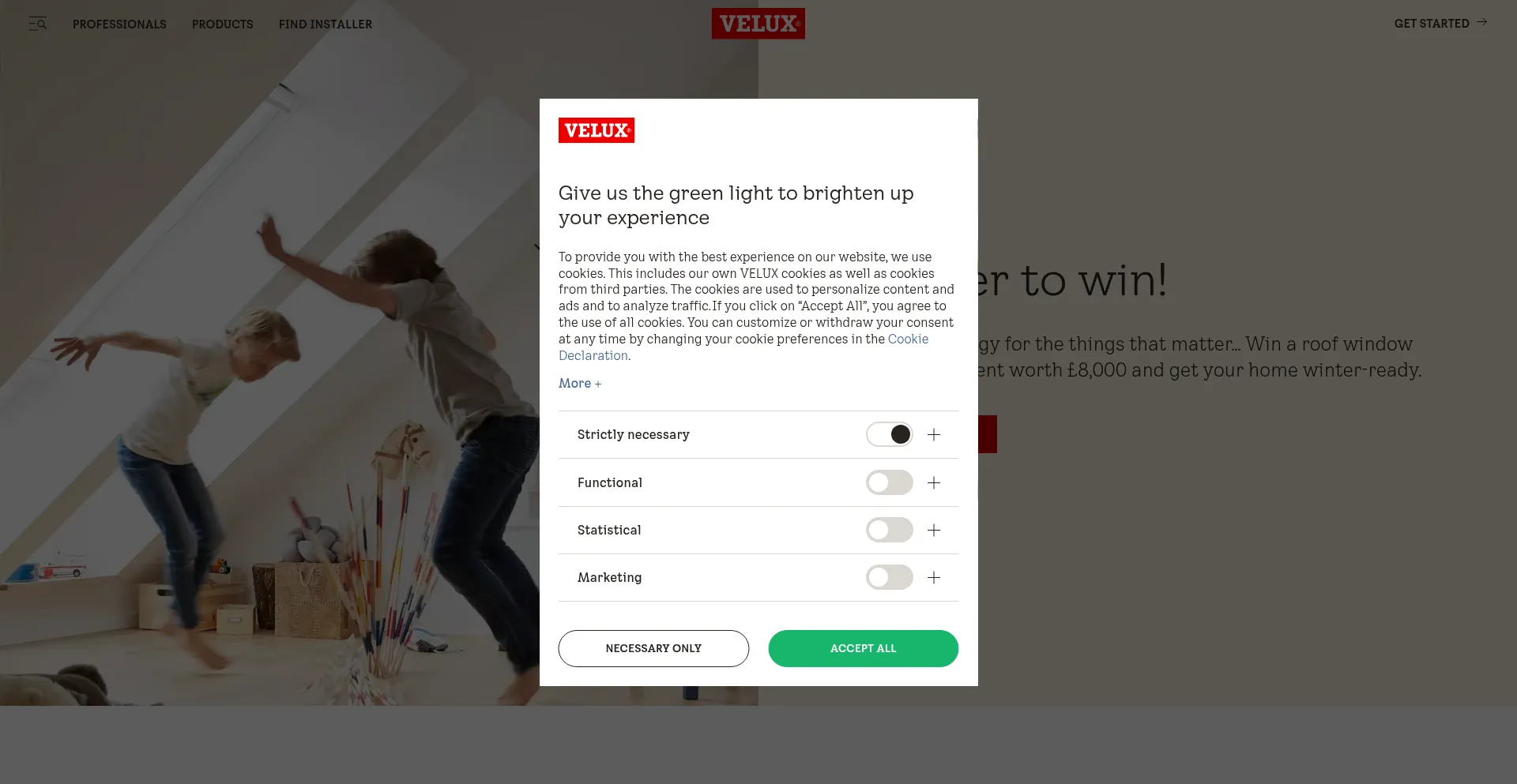 该网站实现符合GDPR或CCPA等隐私法规的cookie同意机制。这表明 velux.uk 遵守数据保护标准并为用户提供对个人数据收集实践的控制。