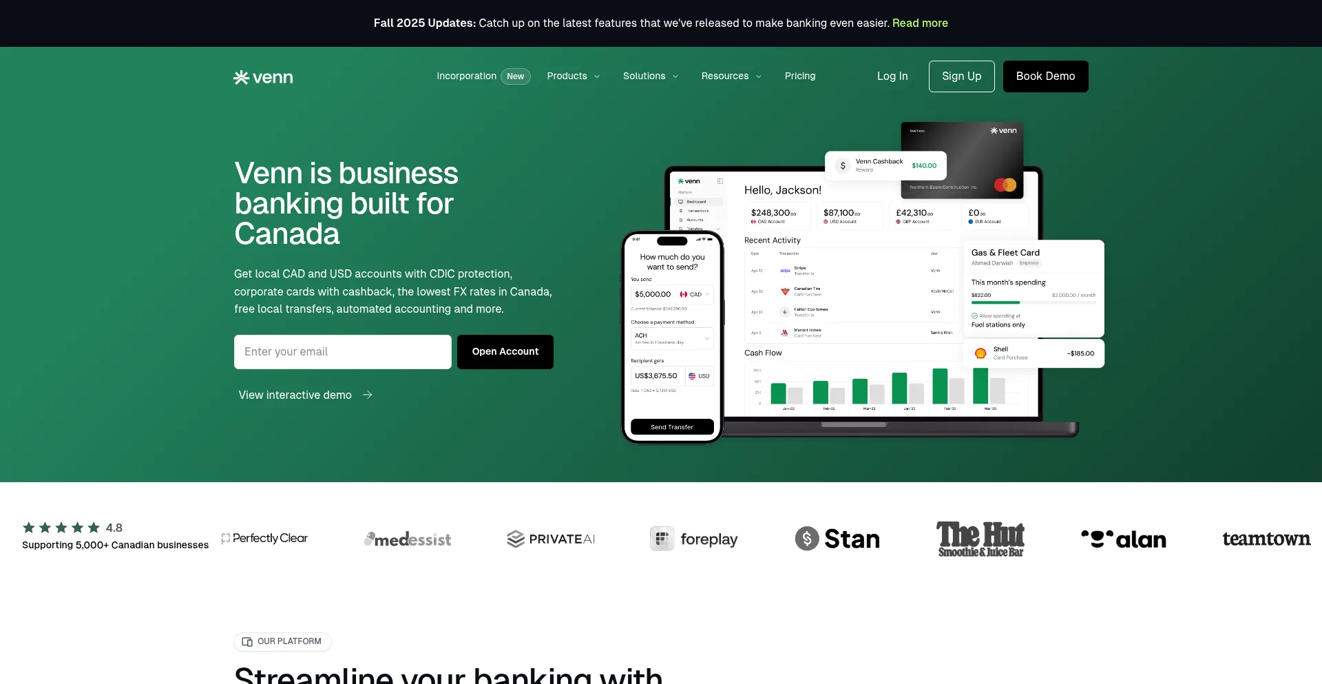 Venn provides Canadian businesses with local CAD and USD accounts, global corporate cards with cashback, free local transfers, automated accounting and low FX rates.