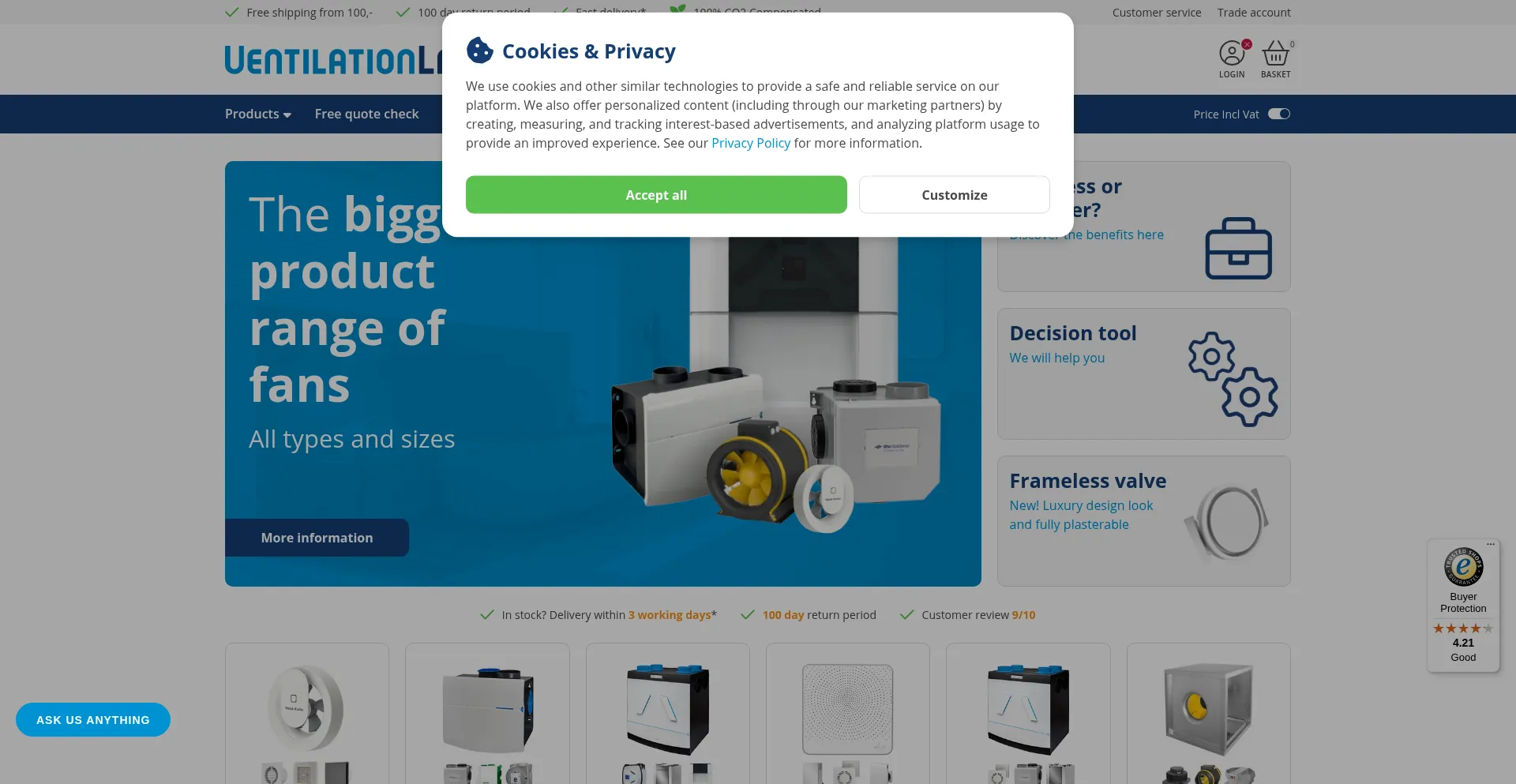 该网站实现符合GDPR或CCPA等隐私法规的cookie同意机制。这表明 ventilationland.co.uk 遵守数据保护标准并为用户提供对个人数据收集实践的控制。