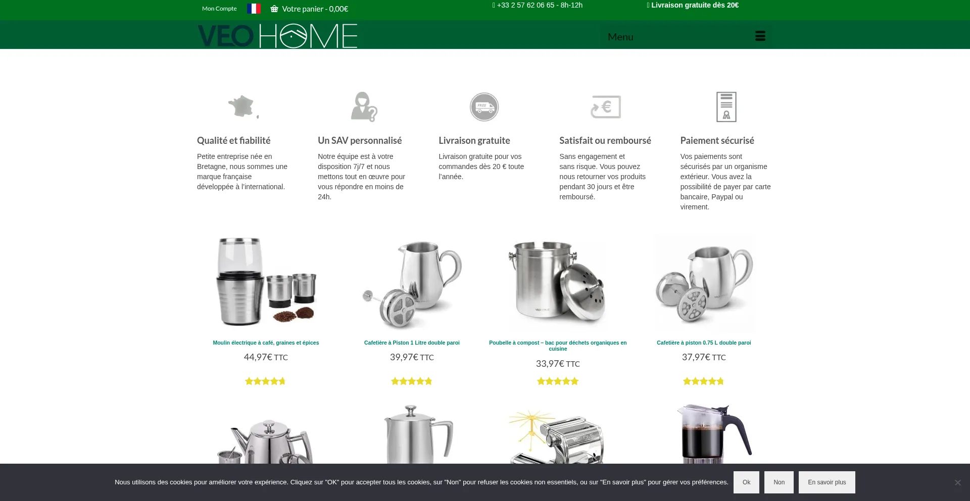 Bienvenue chez VeoHome le spécialiste des produits de qualité de cuisine. Nous vendons en direct nos produits de notre marque VeoHome. Moulin à café, cafetière à piston ou...