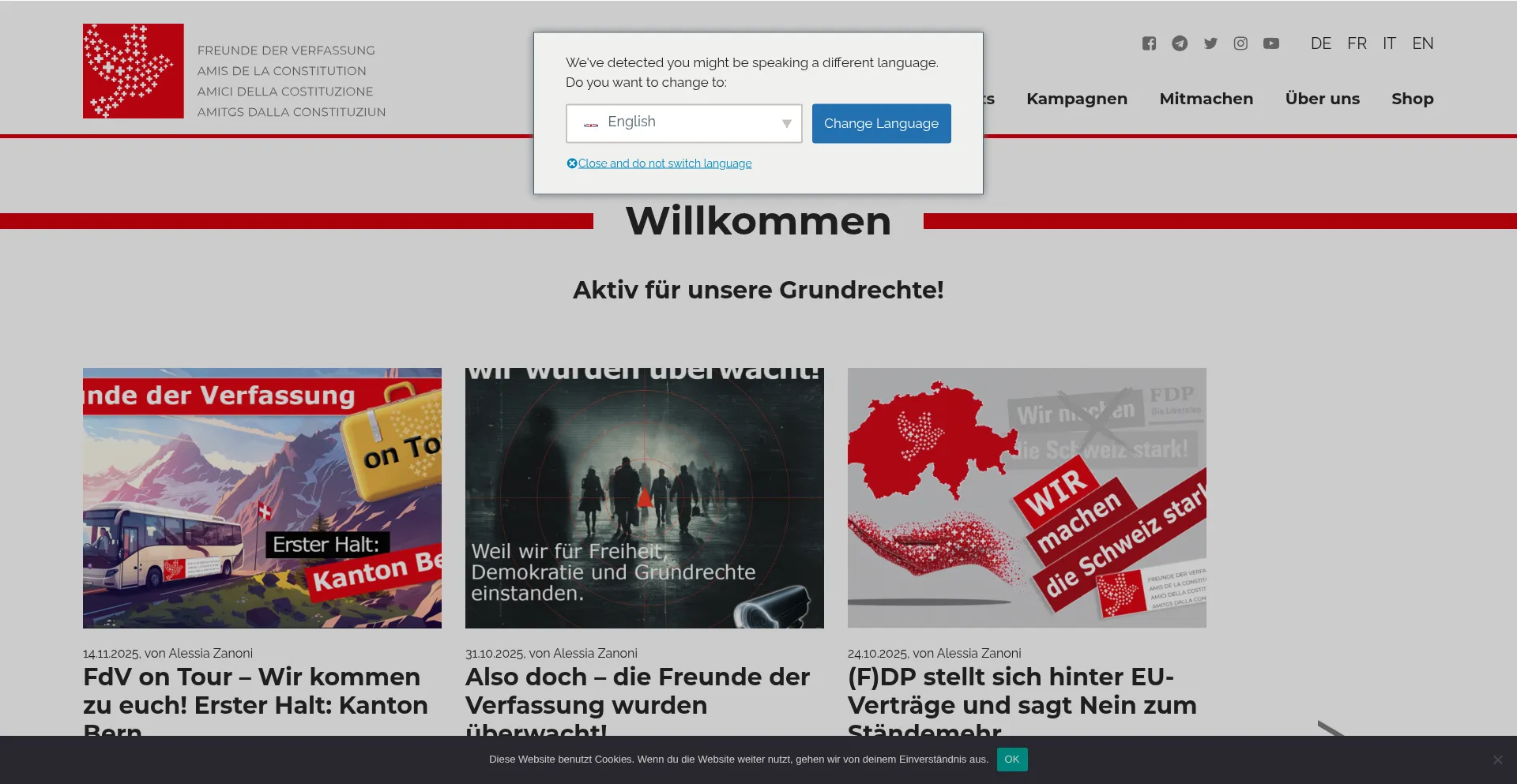 网站上存在社交媒体链接表明 verfassungsfreunde.ch 在社交媒体上维护官方账户,这是可信度和参与度的积极信号。