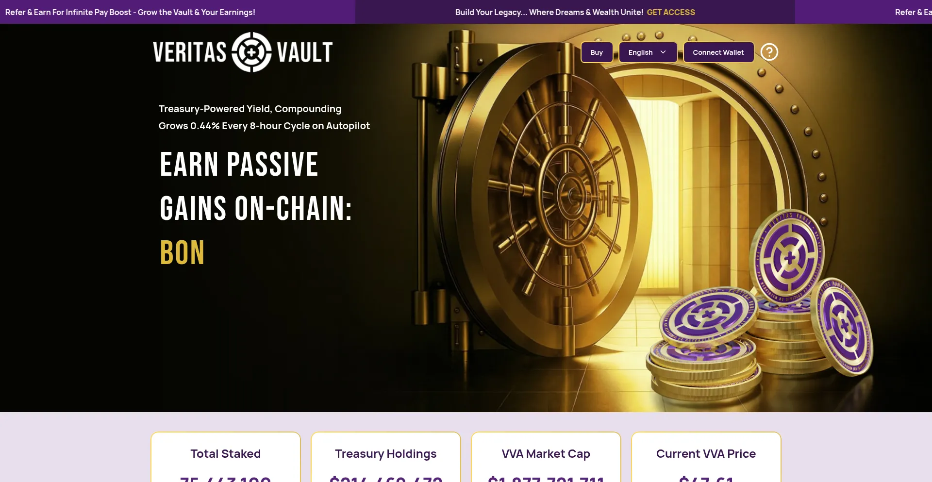 Token staking rewards of approximately 0.44% every 8 hours with Veritas Vault's auto-compounding staking. Treasury-backed rewards, no lock-ups, instant withdrawals. Start buildi...