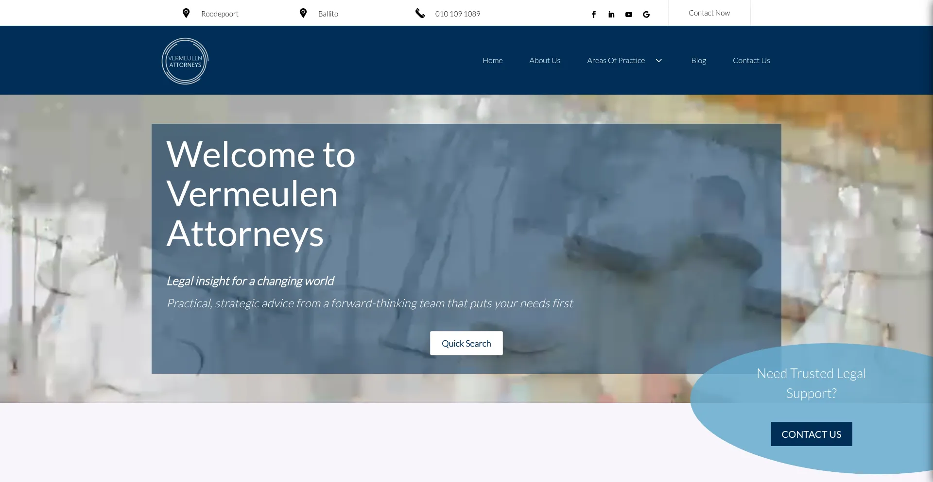 网站上存在社交媒体链接表明 vermeulenlaw.co.za 在社交媒体上维护官方账户,这是可信度和参与度的积极信号。