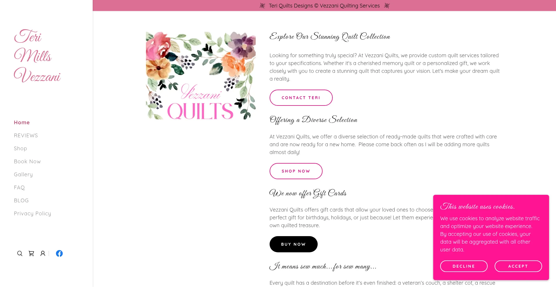 该网站实现数据收集表单,请求个人信息,包括姓名、电子邮件地址、电话号码或其他敏感详细信息。用户应验证 vezzaniquilts.shop 的合法性并在提交个人数据前查看隐私政策。