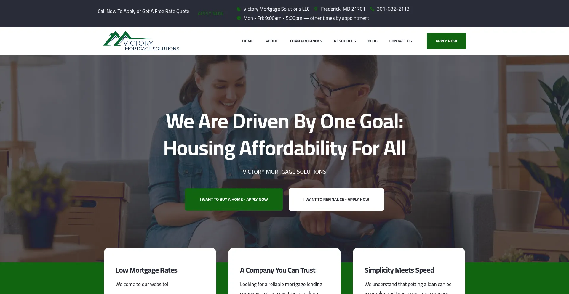 We are driven by one goal: housing affordability for all VICTORY MORTGAGE SOLUTIONS I want to buy a home - Apply Now I want to refinance - Apply Now Low Mortgage Rates Welcome t...