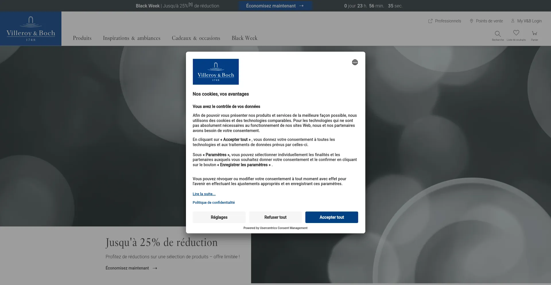 该网站实现符合GDPR或CCPA等隐私法规的cookie同意机制。这表明 villeroy-boch.be 遵守数据保护标准并为用户提供对个人数据收集实践的控制。