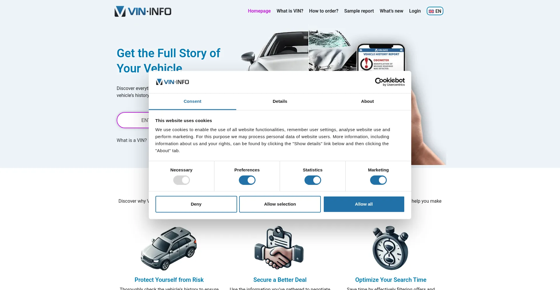 该网站实现符合GDPR或CCPA等隐私法规的cookie同意机制。这表明 vin-info.com 遵守数据保护标准并为用户提供对个人数据收集实践的控制。