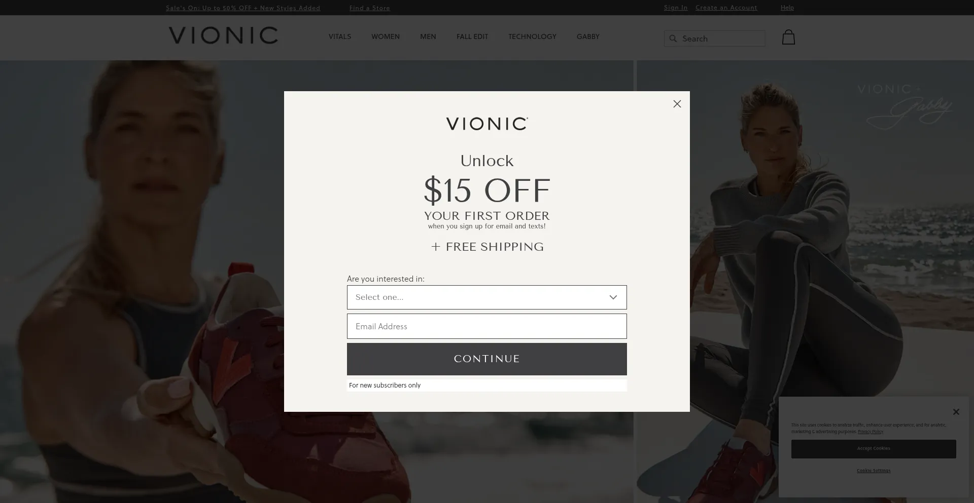 该网站实现符合GDPR或CCPA等隐私法规的cookie同意机制。这表明 vionicshoes.com 遵守数据保护标准并为用户提供对个人数据收集实践的控制。