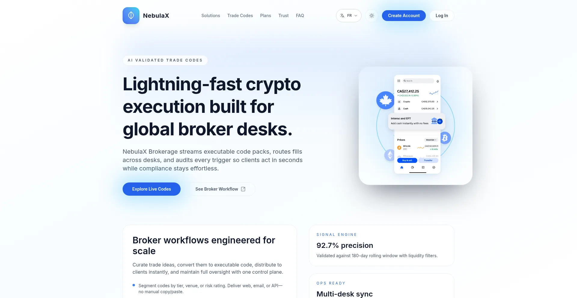 NebulaX Brokerage delivers AI-validated crypto trade codes, compliant automation, and real-time intelligence for broker desks and pro traders.