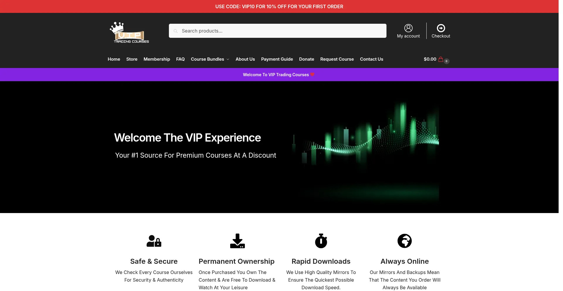 分析表明 viptradingcourses.com 作为电子商务平台运营,促进商品或服务的在线交易。该网站实现了购物车功能、支付处理系统和产品目录功能,这些是商业零售运营的典型特征。