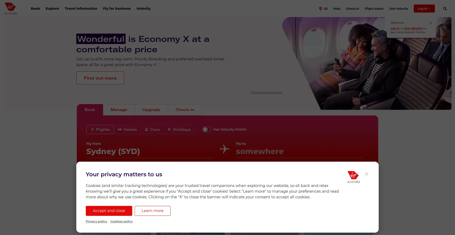 该网站实现符合GDPR或CCPA等隐私法规的cookie同意机制。这表明 virginaustralia.com 遵守数据保护标准并为用户提供对个人数据收集实践的控制。
