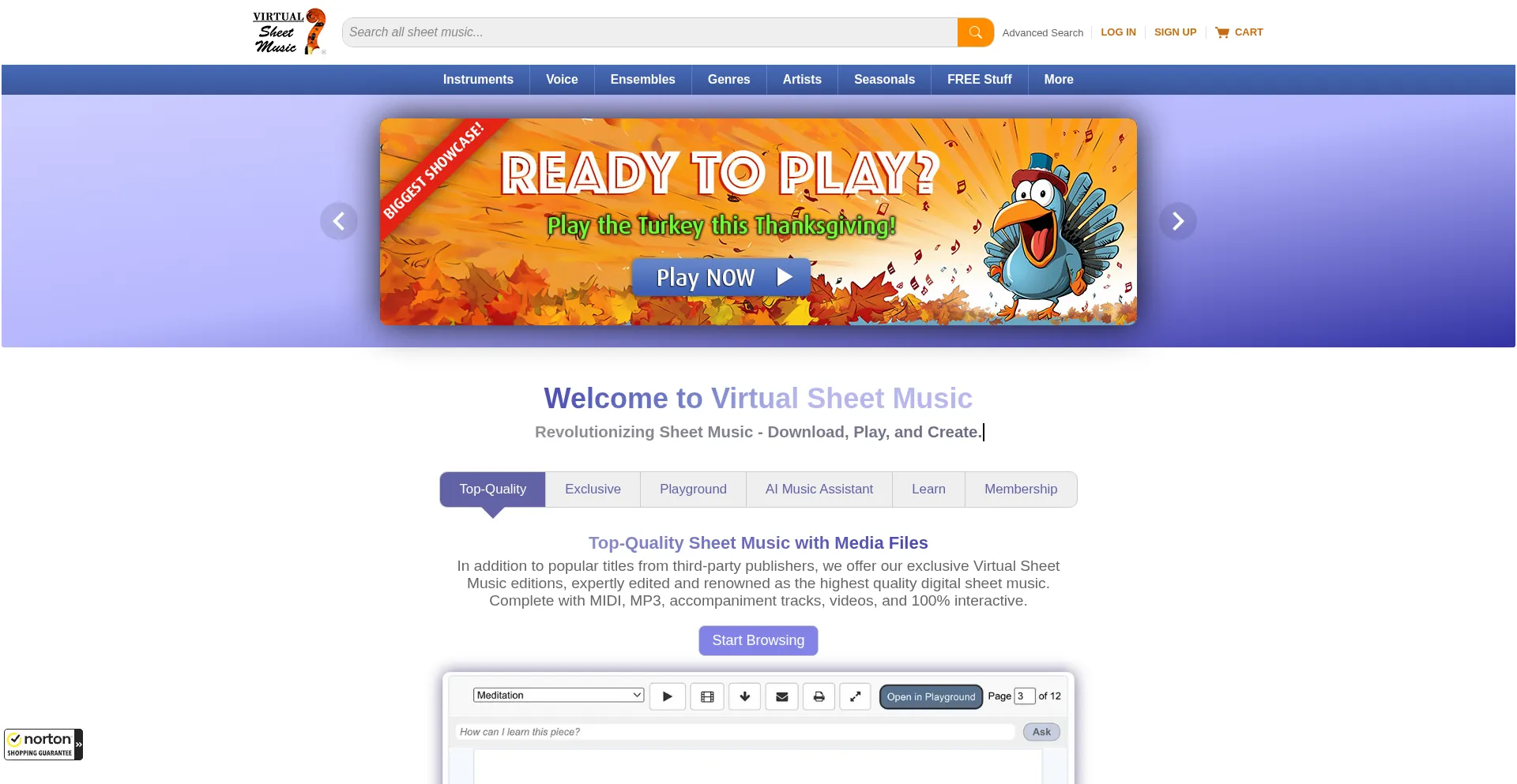 该网站显示来自认可机构的安全认证或信任印章,表明符合安全标准、数据保护协议或行业法规。来自 virtualsheetmusic.com 的信任印章表明遵守已建立的安全实践和运营透明度。