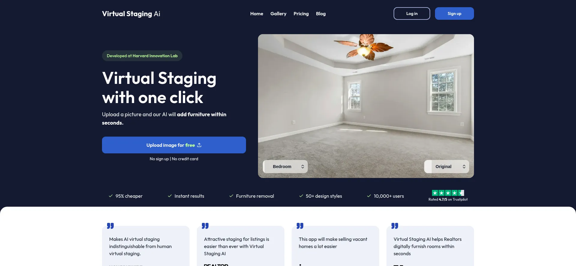 Virtual Staging by AI for only $1 per image. Try for free and get instant results. Highly realistic furnishings. Developed at Harvard Innovation Lab.