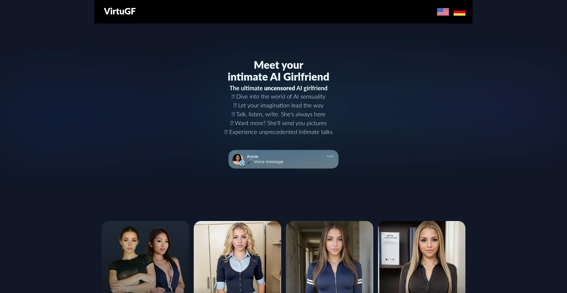 Experience VirtuGF's magic and dive into the world of AI sensuality with your uncensored AI girlfriend. Engage in immersive conversations, tailored to your preferences. Enjoy se...